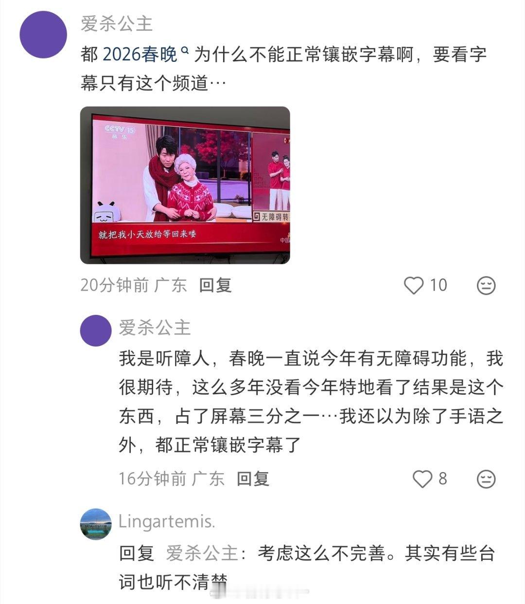 2026春晚吐槽对听障人士不友好,没有正常镶嵌字幕,有些台词听不清楚