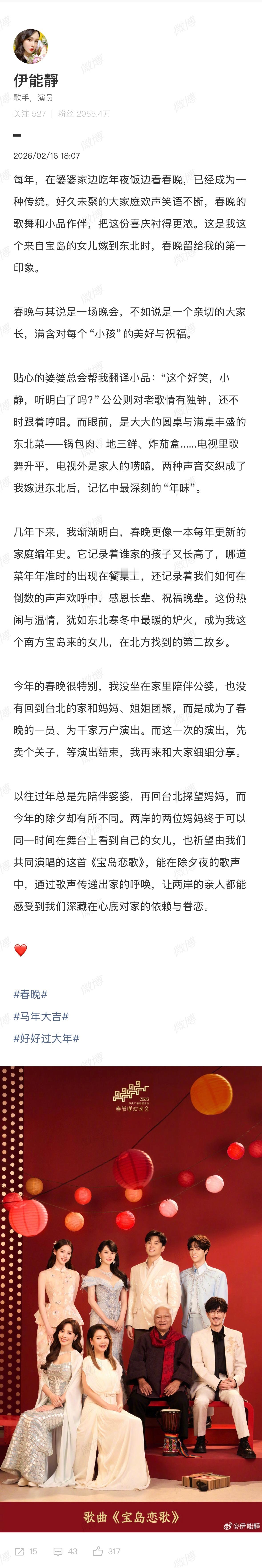 伊能静春晚小作文伊能静春晚小作文,说春晚成为了她北方的第二故乡,期待今晚的春晚
