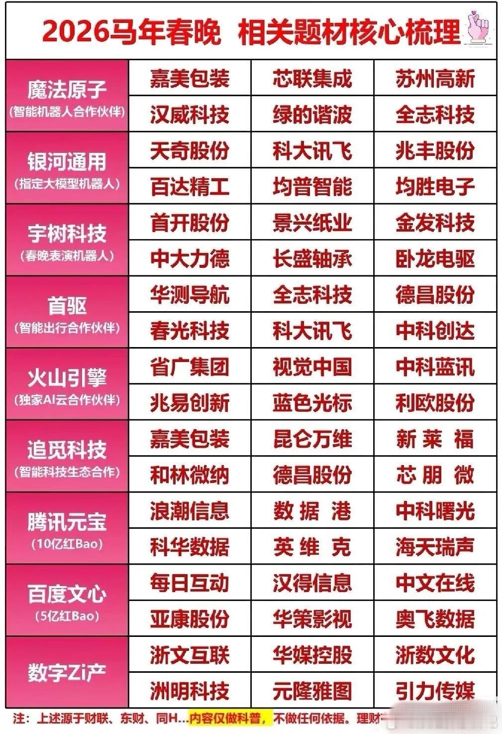 2026年春节主题概念股一、食品饮料(最稳)白酒(礼赠+聚餐):贵州茅台、五粮液、山西汾酒、泸州老窖、迎驾贡酒预制菜/速冻(年夜饭+囤货):安井食品、三全食品、味知香、广州酒家大众食品(礼盒+刚需):伊利股份、金龙鱼、海天味业、洽洽食品二、影视院线(春节档核心)院线:中国电影、万达电影、横店影视、博纳影业内容/发行:光线传媒(哪吒IP)、浙文影业、上海电影三、文旅/出行/酒店(弹性最大)景区/演艺:宋城演艺、九华旅游、峨眉山A、长白山(冰雪)酒店:首旅酒店、锦江酒店、华天酒店航空/机场:中国东航、南方航空、春秋航空、上海机场免税:中国中免(离岛+机场)、王府井、百联股份四、零售/商超(年货+消费回流)永辉超市、东百集团、三江购物、小商品城、红旗连锁五、AI/春晚/数字红包(科技主线)蓝色光标、浙文互联、省广集团、易点天下、利欧股份六、生肖/马年概念(2026马年)福龙马、云中马、万里马、天马科技、海马汽车七、农业/春耕(一号文件预期) 隆平高科、登海种业、农发种业、一拖股份 风险提示:以上仅为题材梳理,不构成投资建议;节前涨幅大、纯题材无业绩标的需谨慎。