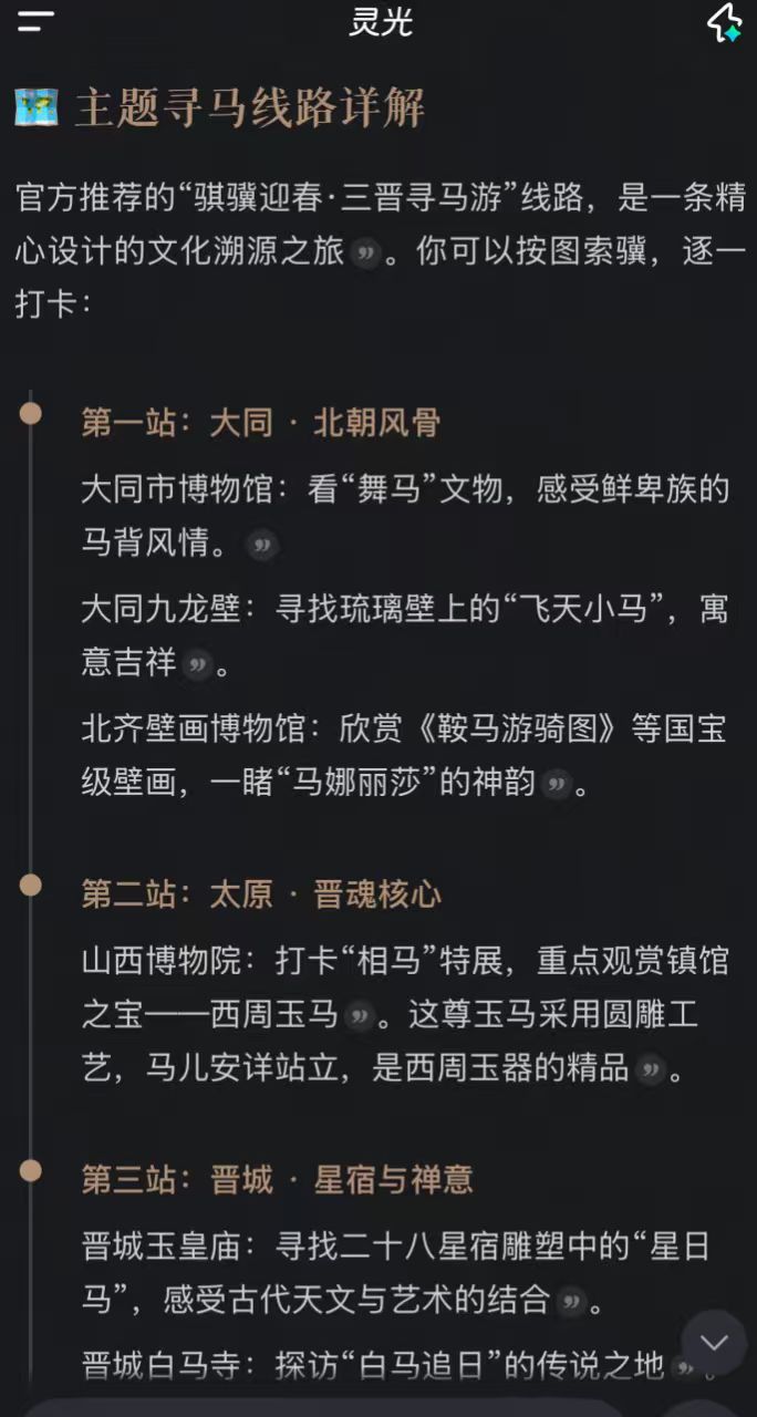我的马年抓马之旅 现代有各种各样的车,古代有各种各样的马,作为重要代步工具,马被古人玩出的花样一点都不比现代人少,我所在的山西最近就有马文物特展活动,问了问灵光,展览分为两大单元,有近200件文物,看多了车,我也打算去看看马了,正好灵光给我做了“寻马路线”,我也要学着古人,去按图索骥一下了。灵光带你去抓马