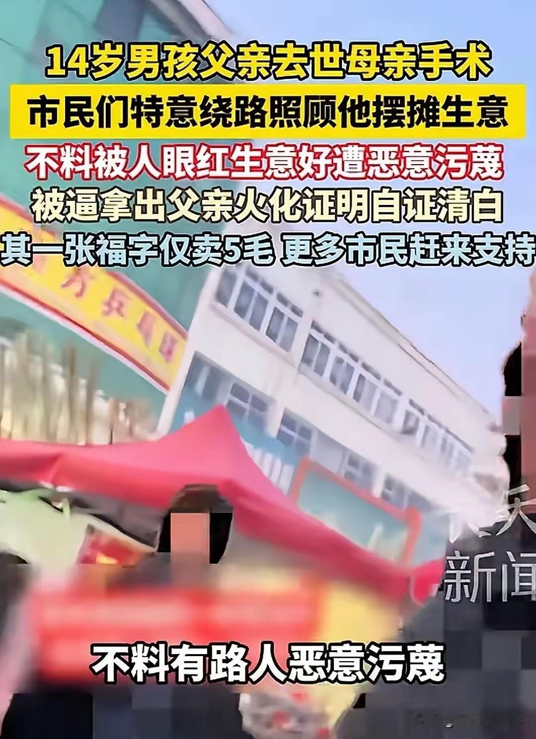 山东,14岁少年,父亲离世,母亲刚做完手术,需要照料,家中实在困难,他就街头摆摊卖对联,一张福字仅卖5毛,不料有路人,居然眼红他生意好,竟然恶意污蔑他,说他的母亲装病博同情,少年无奈,只能拿出父亲的火化证,证明清白,网友愤怒了,这欺负一个孩子干什么? 2026年2月,山东招远的街头年味渐浓,一名14岁少年在寒风中摆摊售卖春联福字的画面,被路人拍下后迅速在网络刷屏,相关话题引发大量网友关注与讨论。 这名少年的父亲不久前因病离世,家中失去了主要经济来源,母亲刚完成一场大型手术,术后身体虚弱无法劳作,日常康复护理与家庭基本开支都没有着落,整个家庭陷入了难以维系的困境。 为了撑起这个家,少年放弃了寒假的休息时间,独自来到街头摆摊,靠着售卖春联和福字赚取微薄收入,维持母子二人的生活与母亲的康复费用。 他将福字定价为每张五毛钱,春联等商品也都定价低廉,从不主动吆喝招揽顾客,只是安静地守在摊位前, 寒风将他的双手吹得红肿开裂,脸颊与耳朵也被冻得发紫,他依旧坚持每天出摊,收摊后还要匆忙赶回家中照料母亲,做饭喂药、打理日常起居,每一件事都做得认真细致。 因为价格实惠、少年懂事坚韧,他的摊位渐渐吸引了不少好心市民驻足购买,大家都想力所能及地帮一帮这个孩子,摊位前的人气也比周边其他摊位更旺。 可这份来自陌生人的善意,却引来了个别路人的眼红与恶意,有人看着少年的生意越来越好,便在一旁无端揣测、散布不实言论, 恶意污蔑少年的母亲是装病博同情,声称少年摆摊是刻意卖惨牟利,这些刺耳的话语不断传到少年耳中,让本就承受着生活重压的孩子倍感委屈与无助。 面对毫无根据的指责与污蔑,少年没有办法用言语自证清白,只能在万般无奈之下,从随身物品里拿出父亲的火化证明,默默展示给身边的人看,用这份沉重的证件,证明自己家庭遭遇的真实性。 一张薄薄的火化证,承载着少年失去亲人的悲痛,也藏着他不被理解的委屈,在场的路人看到这一幕无不动容,心里满是对少年的心疼与对恶意造谣者的气愤。 事件在网络上发酵后,网友们纷纷表达对少年的心疼与支持,怒斥恶意污蔑的行为不该针对一个未成年孩子,更多好心市民专程赶往少年的摊位购买春联福字,用实际行动为他送去温暖,希望能帮这个坚韧的少年减轻一点生活压力。 少年始终坚守自食其力的底线,面对市民主动多付的钱款,都会礼貌退回,不愿接受无偿施舍,稚嫩的肩膀扛起家庭责任的模样,成为这个春节最让人揪心的画面。 对此,你们有什么看法,欢迎评论留言~
