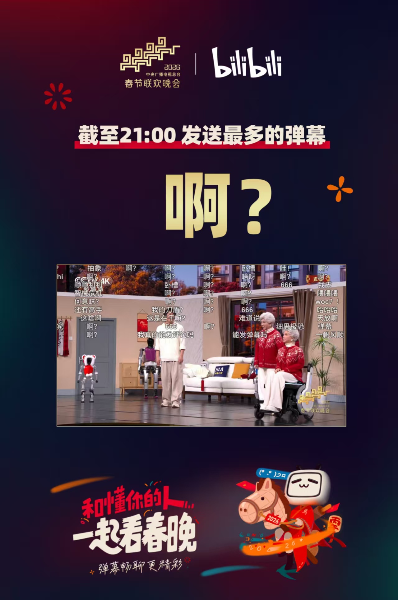 春晚直播间发送最多的弹幕 笑不活了!B站春晚直播间的“含啊量”爆表,发送最多的弹幕居然是“啊?”。高峰出现在蔡明的小品《奶奶的心愿》,看来大家都和UP主菜菜子的朋友一样,被剧情整懵圈了😂