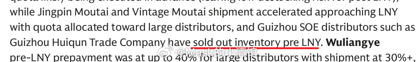 这个反差说明了啥?说明高端白酒市场正在发生一场你看得见但可能理解不透的分化!今年春节前的白酒销售情况非常分裂。超高端的酒卖得特别好,尤其是茅台,简直是一枝独秀!但中低端白酒和地方品牌日子就没那么好过了,销售压力很大,经销商库存积压严重。咱们先说说茅台的表现。渠道调研数据显示,茅台春节前的预收款和出货情况是所有品牌里最坚挺的。1月和2月的配额在多个地区已经全部执行完了,甚至有些地方开始提前执行3月份的配额。 这意味着啥?意味着春节后经销商去库存的压力很小,因为货已经卖出去了!贵州当地的国有经销商,比如贵州汇群,春节前就把库存卖光了。