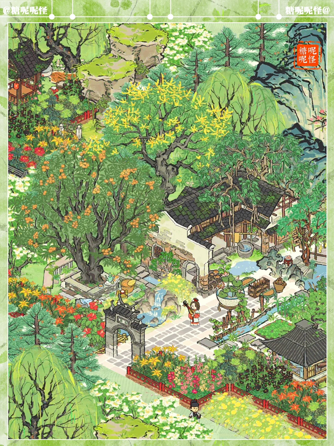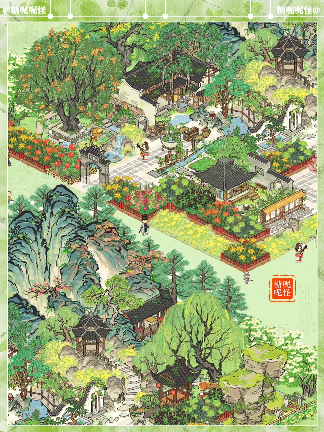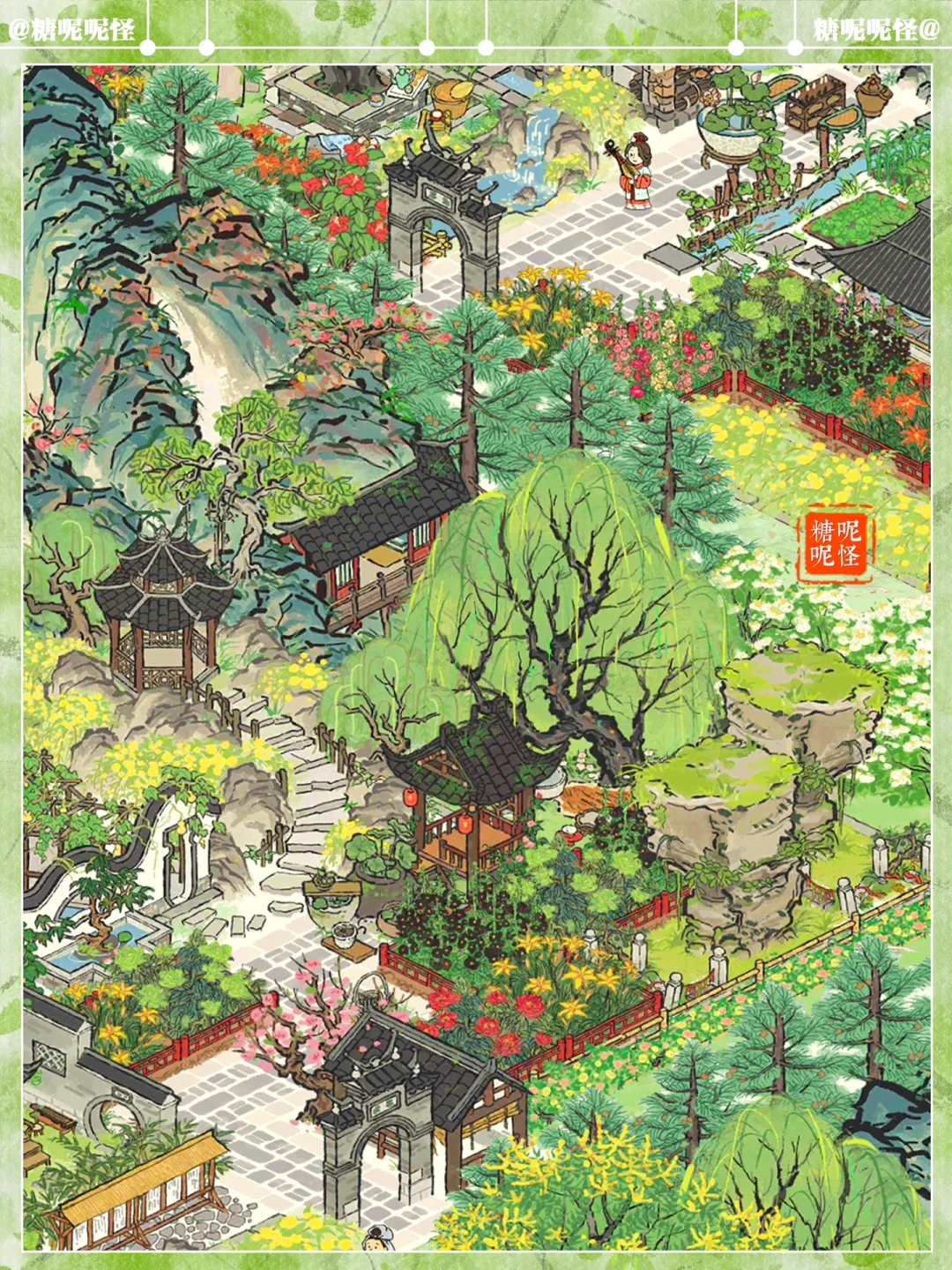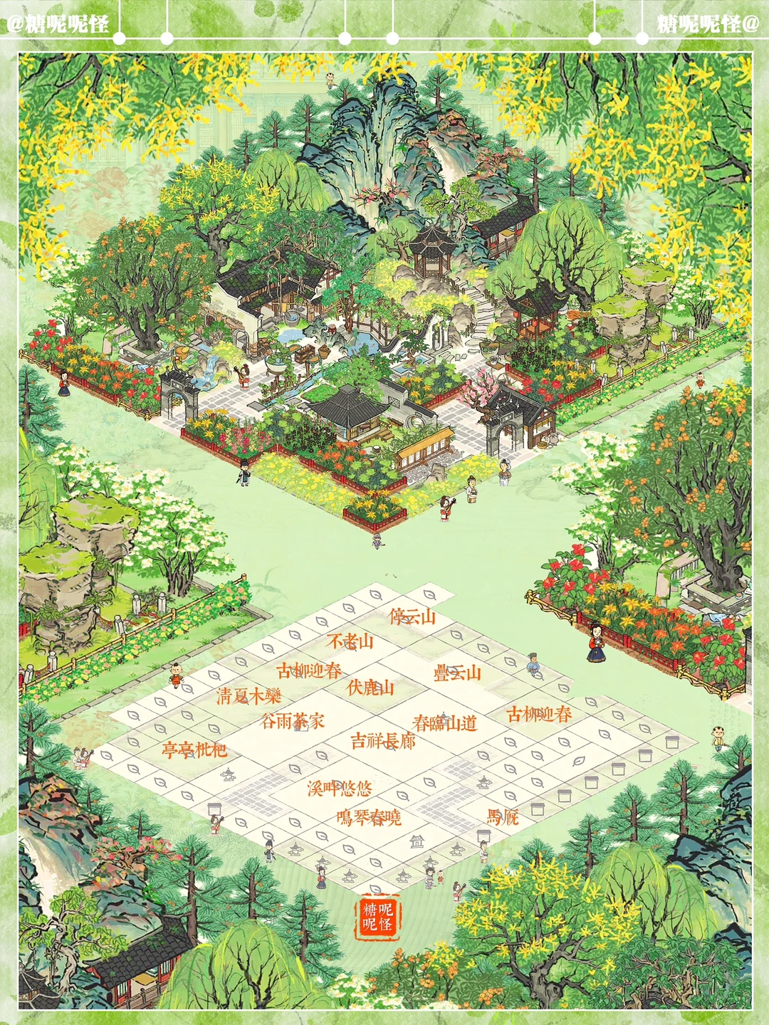 🌿谷雨茶家+吉祥长廊+春临山道+溪畔悠悠,完美衔接道路和水景 ☘️建筑:谷雨茶家|溪畔悠悠|春临山道|吉祥长廊|古柳迎春|鸣琴春晓|亭亭枇杷|蘑菇石|叠云山|不老山|停云山|清夏木栾