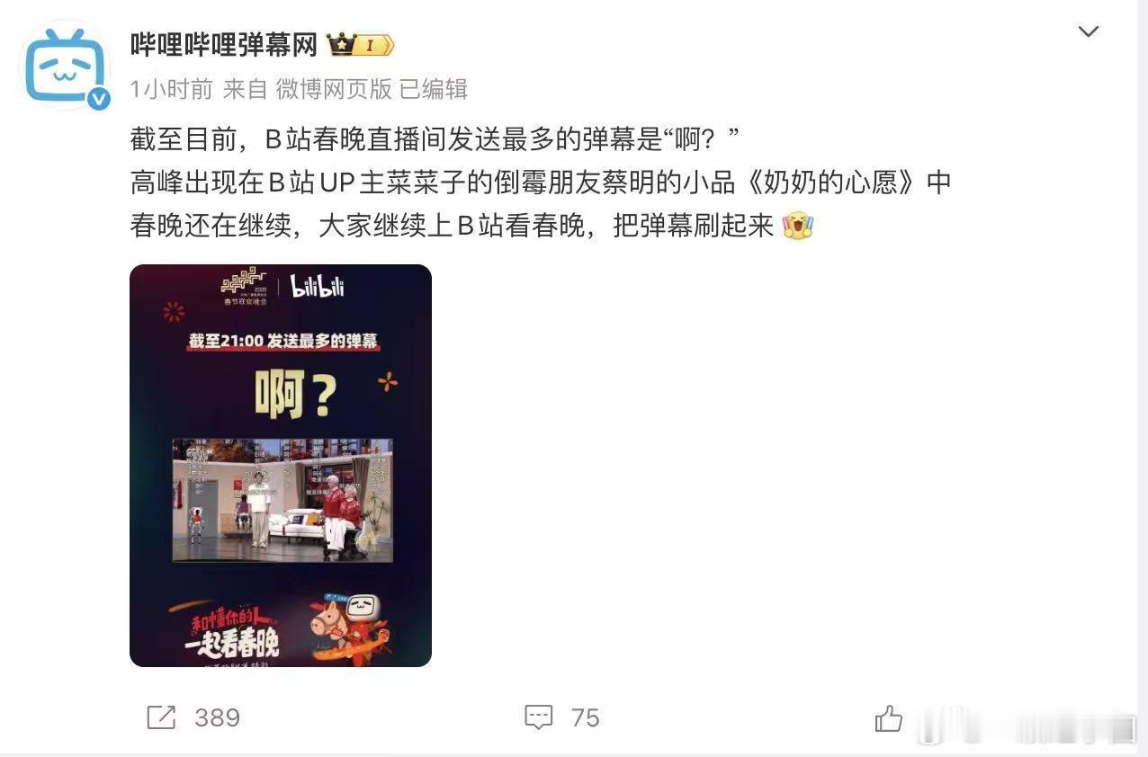 春晚直播间发送最多的弹幕 春晚直播间弹幕最多的你们想不到吧,是“啊?”哈哈哈,来自蔡明老师的小品奶奶的心愿,看来大家很爱小品,我也超爱!
