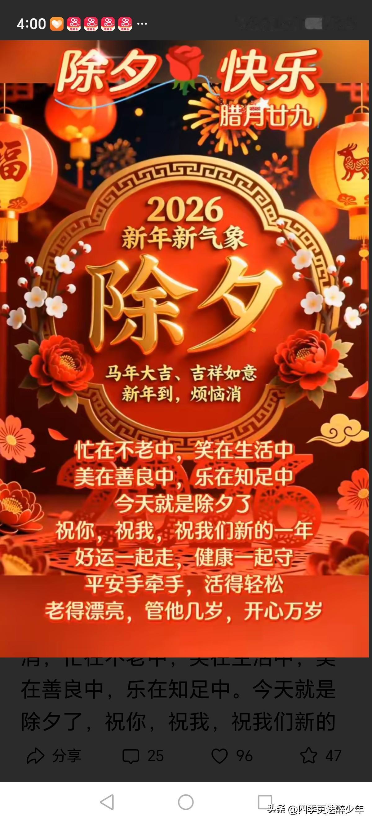 普天同庆: 又看电视又看烟花, 屋里屋外节日互动。 饺子飘香盛满幸福, 华夏团圆有目共睹。 感谢祖国为民造福, 幸福安康国防牢固。 国防官兵精心守护, 华夏同胞迎春纳福。