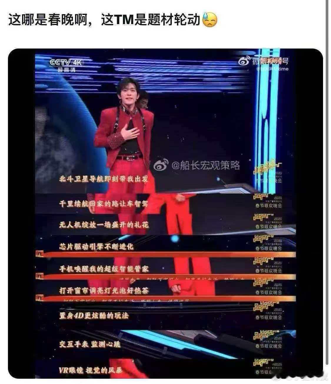 今年春晚科技产品之多,应该叫产品春晚,但这些产品背后关系到股民的情绪,所以春晚又属于股民的,也可以称之为筹码春晚,简称筹晚。