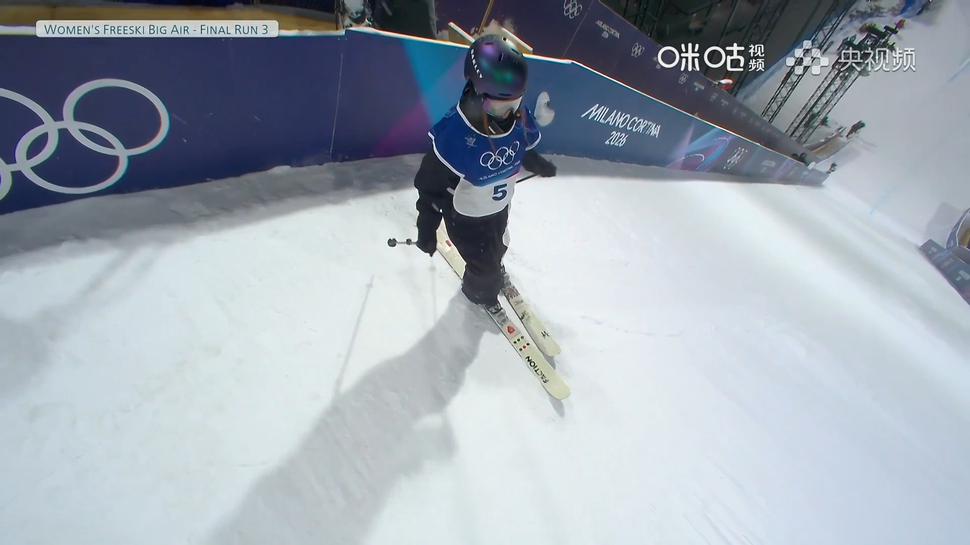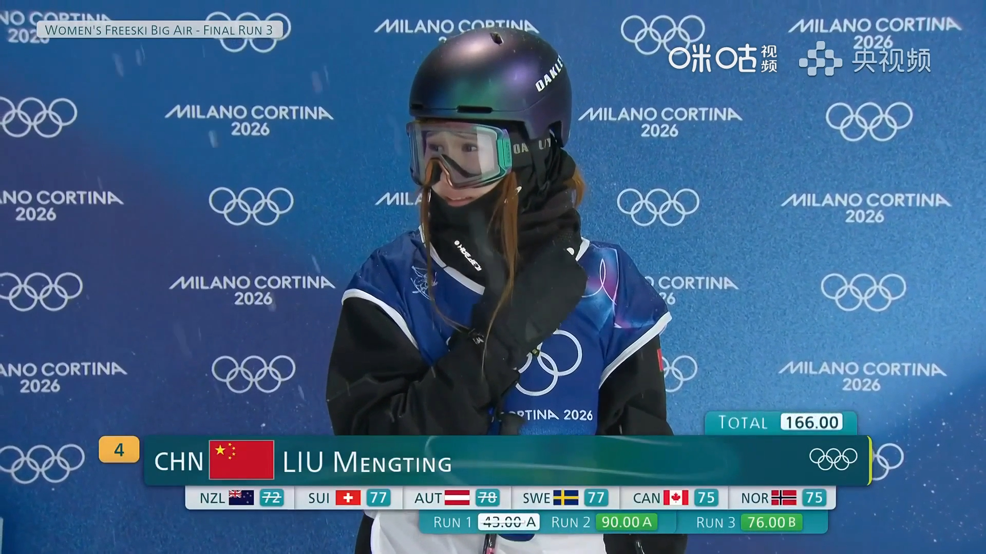 米兰冬奥会自由式滑雪女子大跳台决赛,刘梦婷第三跳1440完成,得到76.00分,总分166.00分。