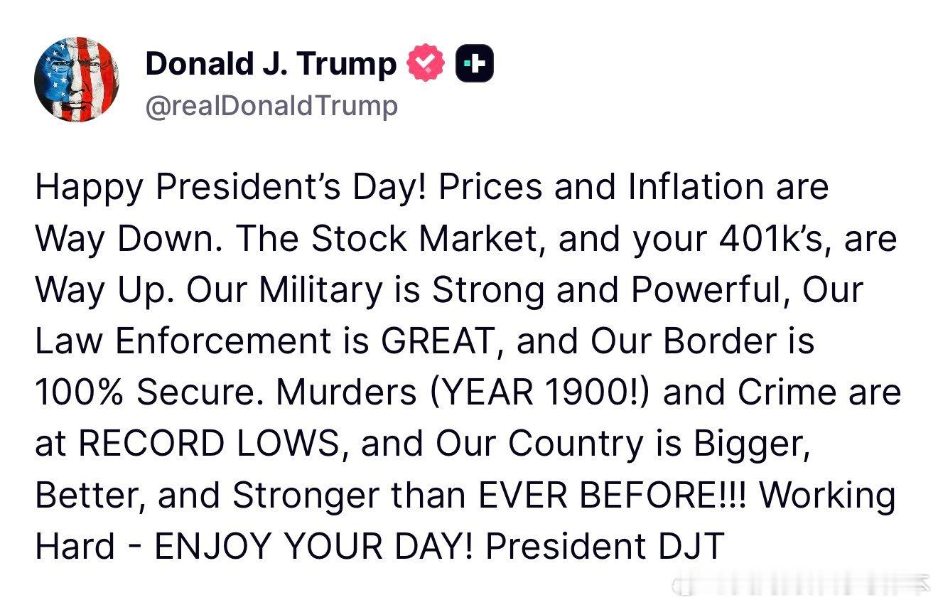 总统日快乐!物价和通货膨胀大幅下降。股市,以及你们的401(k)退休账户,大幅上涨。我们的军队强大有力,我们的执法部门非常出色,我们的边境100%安全。谋杀案(1900年以来!)和犯罪率处于历史最低水平,我们的国家比以往任何时候都更大、更好、更强!!!努力工作——祝你们节日愉快!
