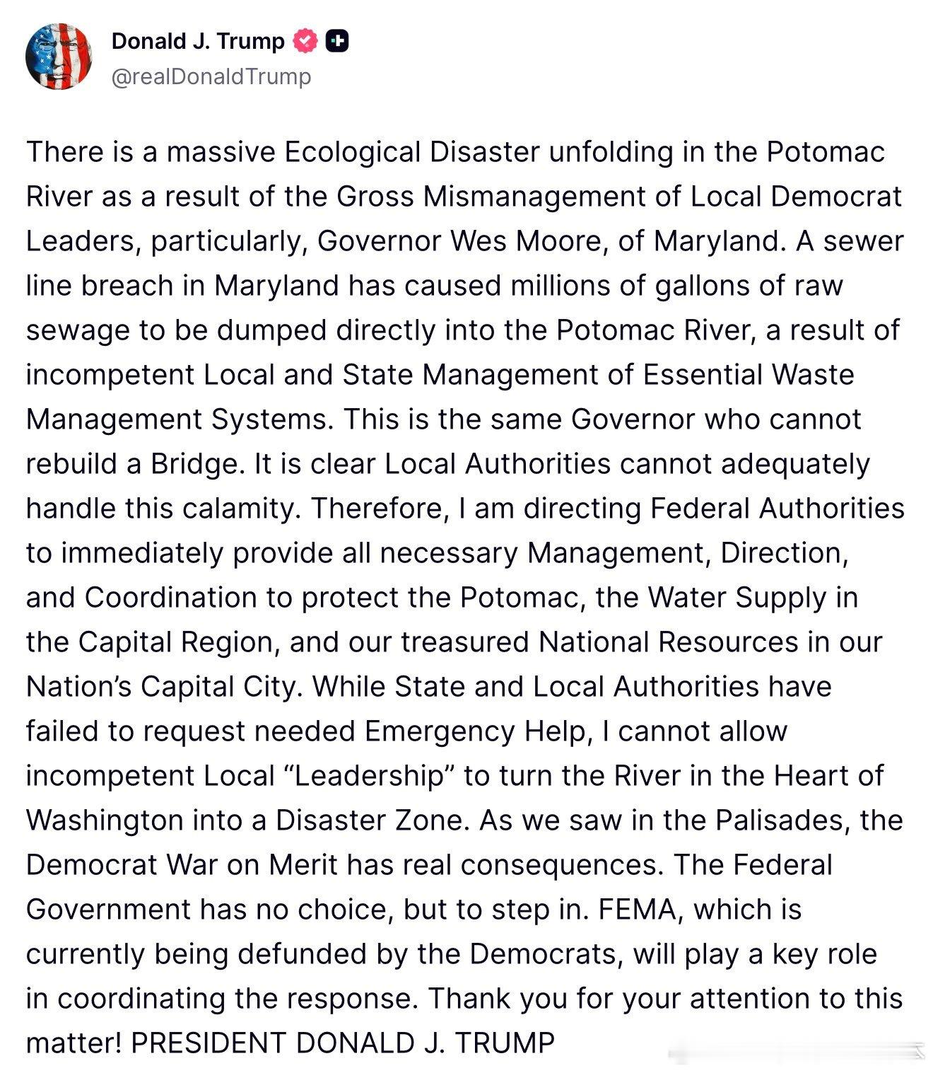 尽管州和地方当局未能请求所需的紧急援助,我不能允许无能的地方“领导层”把位于华盛顿核心地带的这条河流变成一个灾难区。正如我们在帕利塞兹看到的那样,民主党对“能力”的战争会带来真实后果。联邦政府别无选择,只能介入。