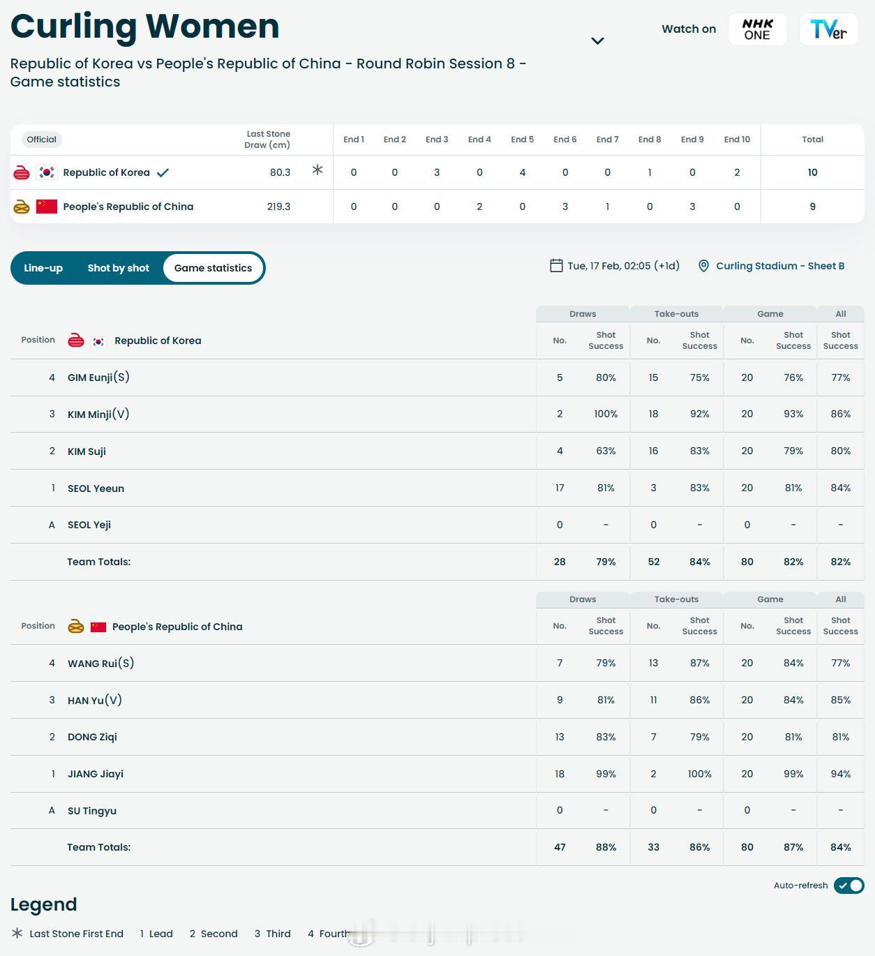 【冬奥女子冰壶中国9-10惜败韩国 2胜4负暂列第七】 中国冰壶女队9比10韩国中国冰壶女队2胜4负冬奥会 2月16日,冬奥会女子冰壶循环赛,中国队与韩国队的比赛大起大落,有4局比赛得分超过3分。中国队在上半场以2-7大比分落后,但下半场奋起直追,在第九局以9-8反超,但在最后一局被拿到两分,以9-10惜败。目前中国队2胜4负排名第七。18日16:05,中国队将对阵丹麦。