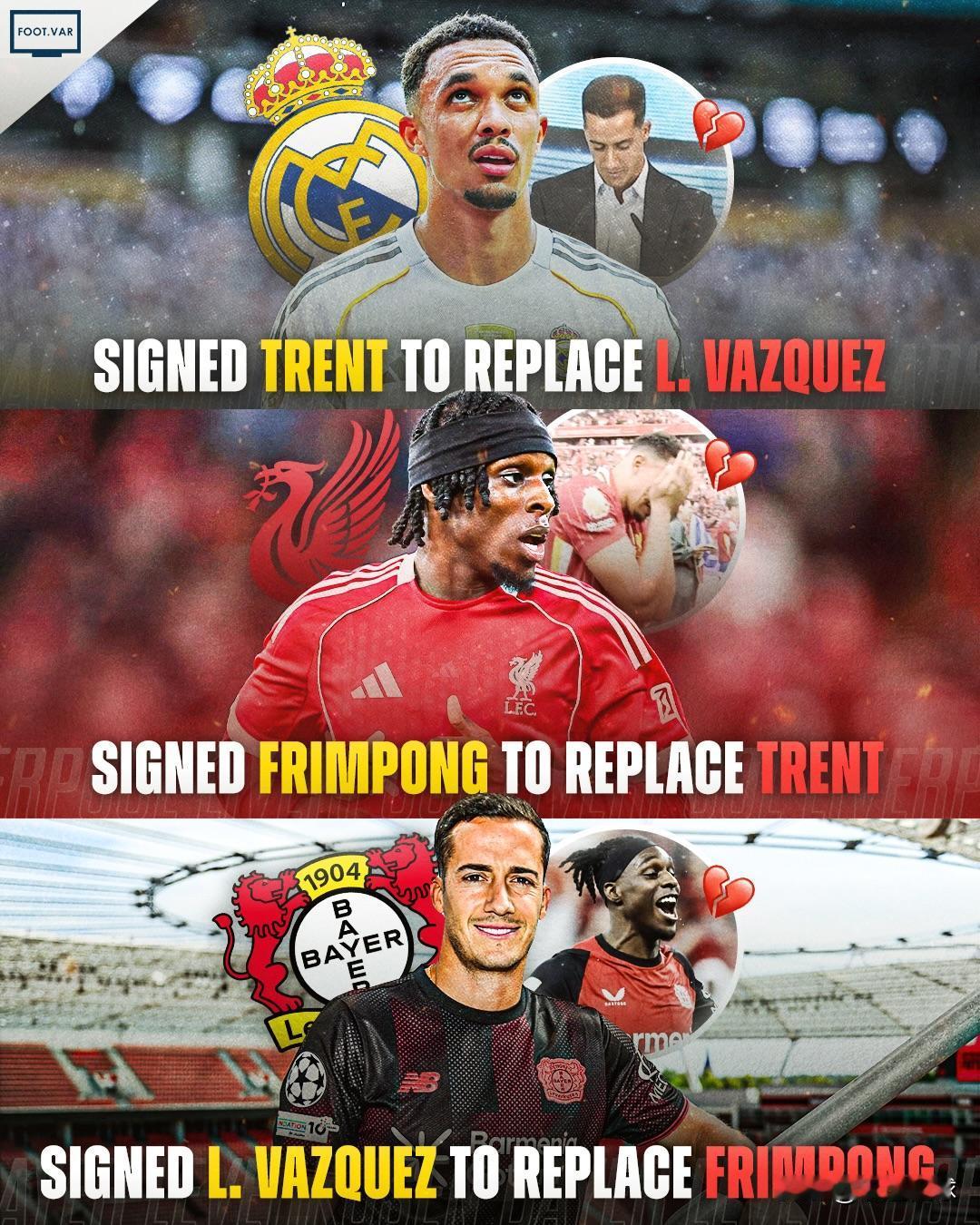 足坛转会史上最离谱的完美闭环!去年夏天,三家豪门玩起边后卫大轮换,如今看严丝合缝中却又透着一丝丝诡异。 去年夏天的转会窗,皇马、利物浦、勒沃库森这三家,居然凑一起搞了波前无古人的操作——把自家的边后卫,玩成了完美的三角互换,兜兜转转一圈,连补人的坑都刚好填上! 🏴󠁧󠁢󠁥󠁮󠁧󠁿 第一环:阿诺德告别利物浦加盟皇马 传了N个赛季的绯闻终于落地,利物浦青训出身的右路天王阿诺德,正式登陆伯纳乌。而利物浦转头就找好了完美替代者,直接瞄准了勒沃库森的当红飞翼弗林蓬。 🇳🇱 第二环:弗林蓬离开药厂加盟利物浦 勒沃库森的主力右后卫弗林蓬,前脚被利物浦挖走补了阿诺德的空缺,药厂后脚就敲定了自己的新援——来自皇马的万金油老将卢卡斯·巴斯克斯。 🇪🇸 第三环:巴斯克斯告别皇马加盟勒沃库森 皇马这边送走了巴斯克斯,刚好迎来了新援阿诺德,严丝合缝填上了右路的位置缺口。 当时看,这波操作还精准踩中了各家的需求: 皇马终于拿下了心心念念多年的传中大师阿诺德,补齐了右路的进攻属性; 利物浦送走了功成名就的老臣,补进了冲击力拉满、适配高位打法的弗林蓬,即战力丝毫不降; 勒沃库森送走了要走的新星,迎来了经验丰富、能左能右能覆盖多个位置的巴斯克斯,即战力和更衣室属性直接拉满。 但赛季已经过去了三分之二,三个人却都出现了同样的问题:伤病过多、出场时间有限! 巴斯克斯,本赛季仅为勒沃库森出场15场比赛,加盟后三次伤病,错过了至少15场比赛。 弗林蓬,本赛季仅为利物浦出场19场比赛,同样是三次伤病,错过了至少16场比赛。 阿诺德,本赛季仅为皇马出场18场比赛,同样是三次伤病,错过了至少9场比赛。 三人登场后,效果立竿见影,但问题就是都不怎么登场。三支球队的球迷,不知道该给这波交易打几分?