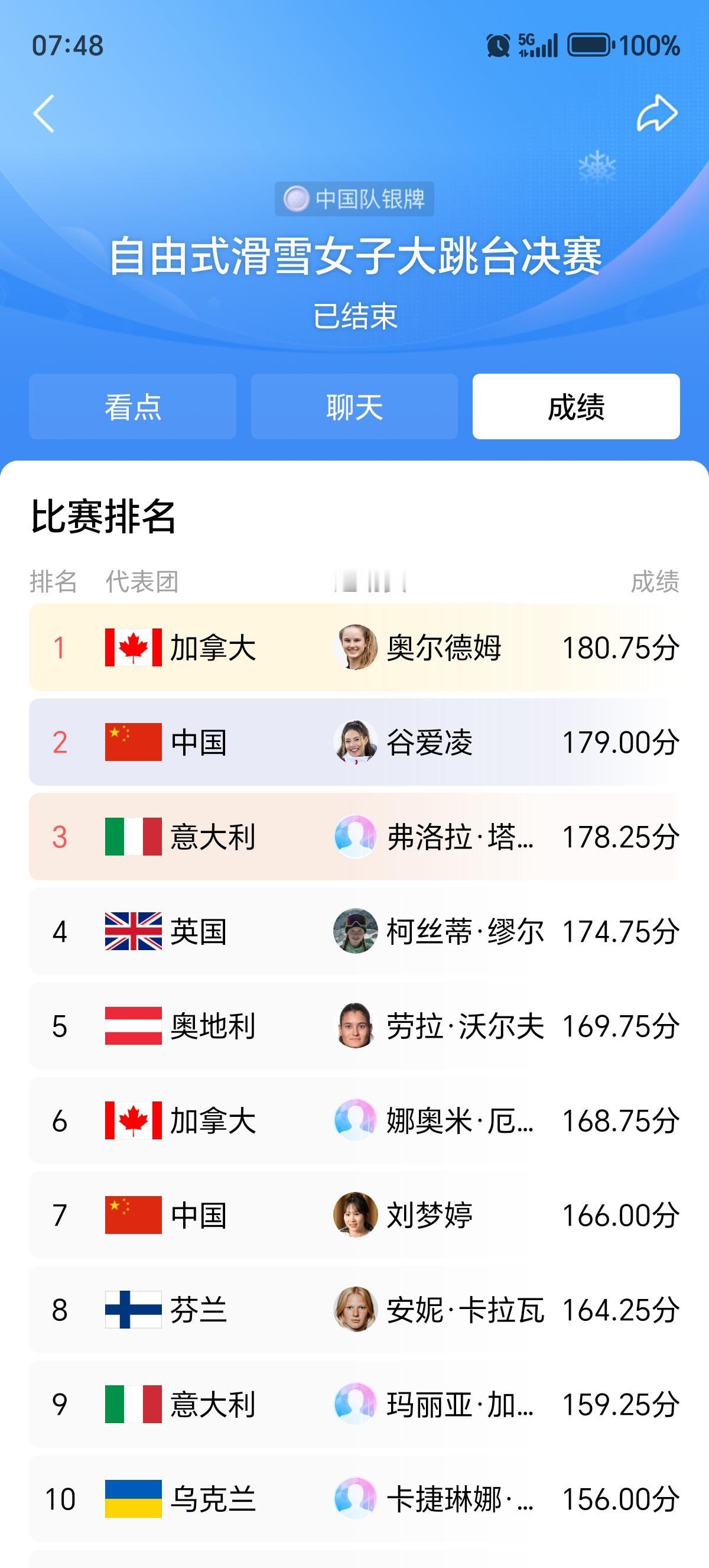除夕晚上准备跟踪一下谷爱凌的大跳台赛事的,毕竟这是她可能夺金的项目,但天气原因赛事推迟,也就只好先睡,想着看说不定早上醒来就能看到好消息呢。 不能不说有点失落啊,最后以1.75分之差惜败给加拿大的奥尔海姆,只拿到银牌,这是中国队第三银,也是谷爱凌个人的第二块银牌。当然失落是期望谷爱凌为中国队夺得金牌,希望她能再创北京冬奥会时的佳绩,并不是苛责她。青蛙公主做得已经够好了!两个项目都出现意外摔倒的情况,都能后续逆袭拿到高分动作,心理素质强大,技术稳定。再看大跳台的成绩榜,只有谷爱凌和刘梦婷两个中国姑娘,倔强的杂在一堆欧美运动员当中,东方人的面目十分醒目亮眼! 谷爱凌虽憾失大跳台金牌,但还是以二银的成绩稳居中国队榜首,说是中国队领军人物,一点不为过。而且在欧美传统冬季项目强国堆里,带着中国队杀出了条血路!大年初一,谷爱凌用一块意义不凡的银牌给我们送上了春节大礼! 加油,青蛙公主! 加油,中国队!
