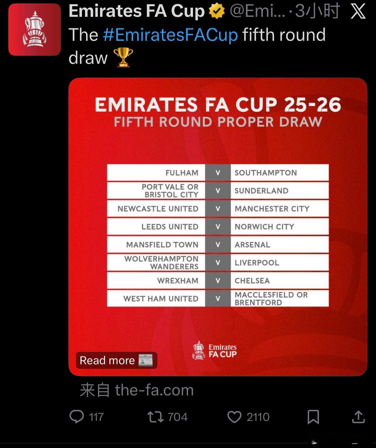 足总杯抽签,阿森纳抽到了英甲球队曼斯菲尔德