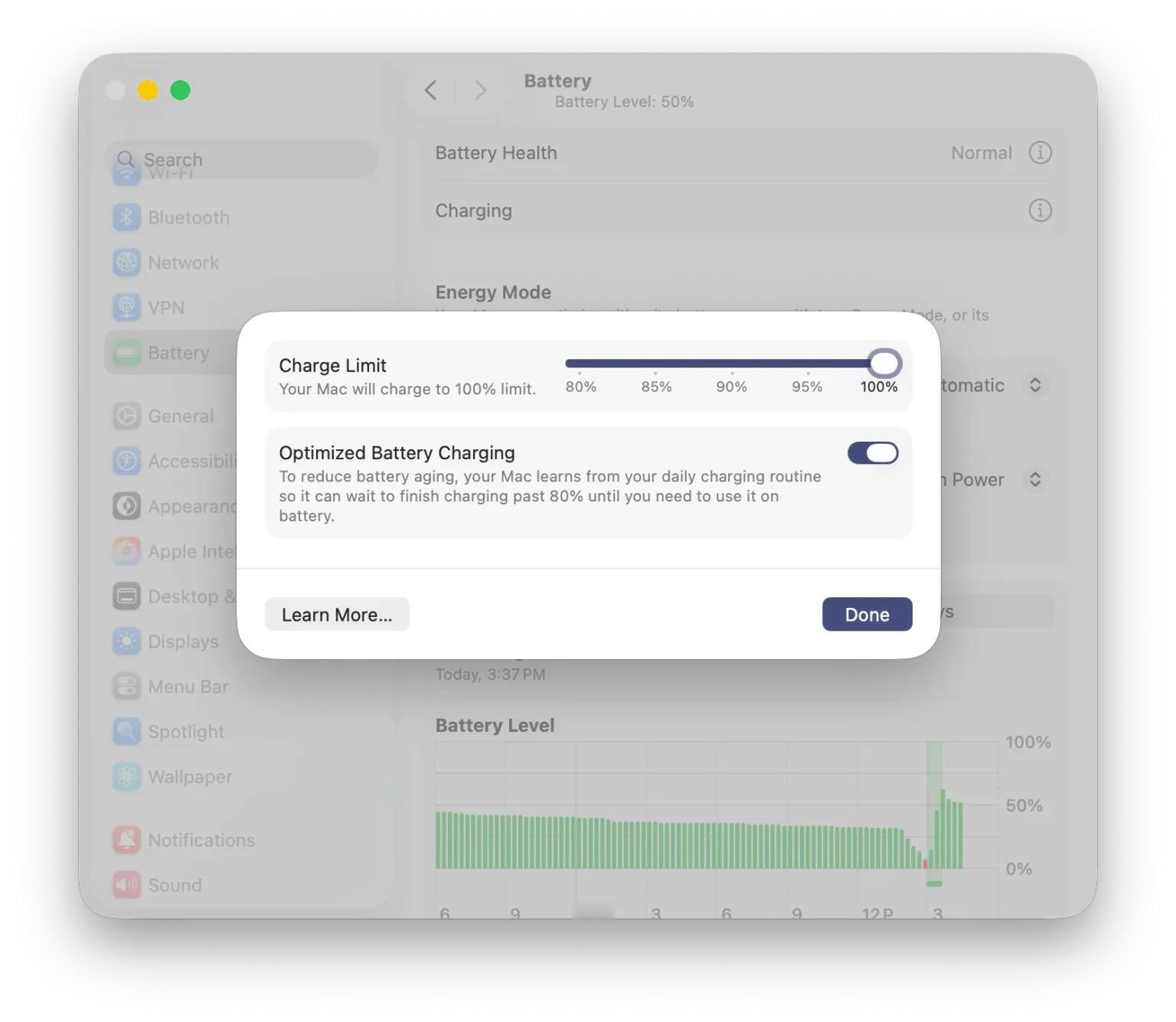 充电限制功能是除优化电池充电之外的一项设置,该功能可以防止 Mac 充电至 100%。