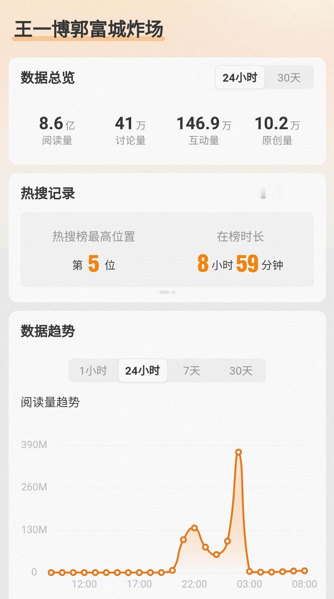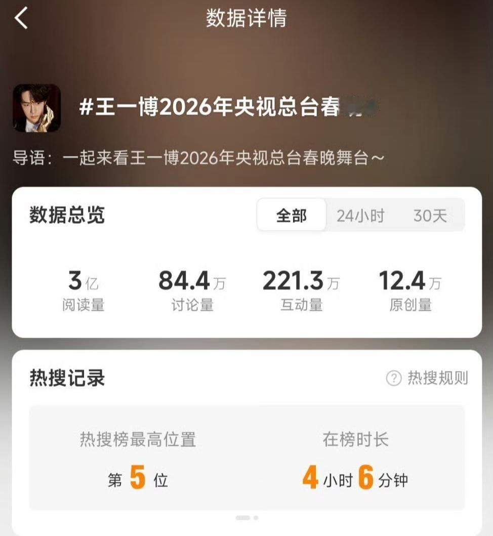 王一博——全方位无短板的“王亿博”! 王一博春晚舞台《闪耀动起来》5.5小时舞台播放量破亿!是马年春晚第一个破亿舞台也是目前为止唯一一个破亿舞台。 王一博的第17个破亿舞台诞生,连续两年春晚舞台破亿! 收视同样登顶峰值,话题度更是直接冲到8.6亿! 万众瞩目的国民巨星,就是大家都想看大家都喜欢看,王一博实实在在的火,火的毫无短板! 王一博 王一博闪耀动起来播放破亿