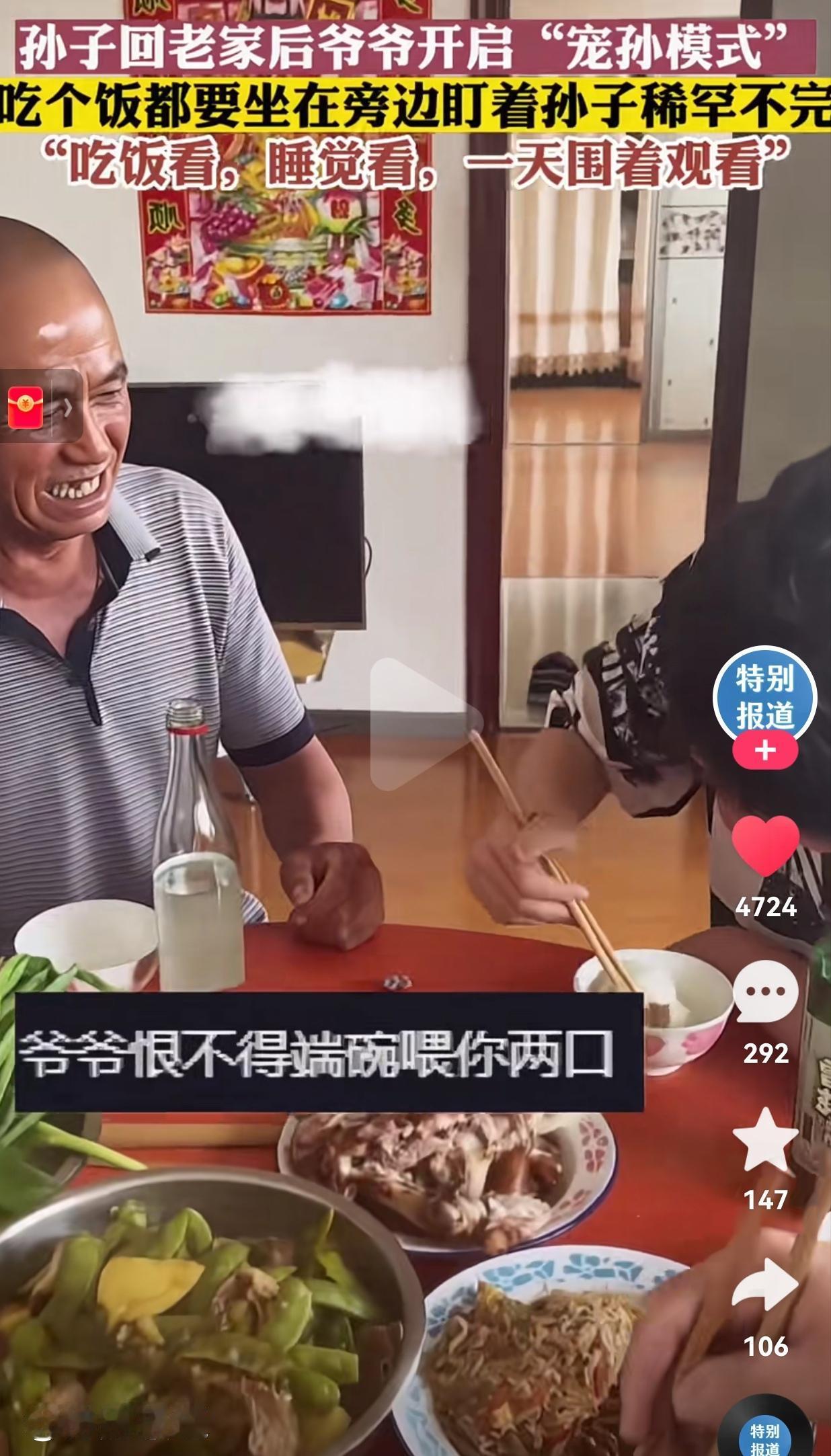 这一刻隔辈疼真的具象化了!孙子回老家过年,孙子吃饭,爷爷全程都盯着看。网友:这哪是宠,分明是把心都掏出来了! 饭桌上,一桌子菜冒着热气,爷爷却没怎么动筷子。他就那么半欠着身子,眼睛直勾勾地盯着埋头扒饭的孙子,嘴角咧到耳根,笑得连后槽牙都露出来了。 据了解,无论孙子干什么?爷爷一直注视着孙子,吃饭看,睡觉看,一天围着看。 我刷到这个视频的时候,一下子就想起了我爷爷。 小时候我回老家,他也是这样。我吃个糖糕,他在旁边盯着,生怕我噎着。我睡个午觉,他搬个小板凳坐在炕头,就那么看着我,一看就是一下午。 那时候我不懂,只觉得爷爷有点“烦”,现在才明白,那眼神里装的,是他攒了一整年的想念。 这个爷爷也是一样。桌上的肉菜是提前炖好的,酒是温了又温的,可他什么都顾不上了。 他的世界里,就只剩下眼前这个半年没见的小崽子。 网友看到后评论说:“爷爷恨不得端碗喂你两口。” 这话一点都不夸张。在老人的眼里,孙子哪怕是喝口凉水,都比山珍海味要紧。 这个爷爷的“宠孙模式”,让我看到了最纯粹的爱——不图回报,不问结果,只要孩子开心,他就觉得值。可我们做子女的,又有多少人能读懂这份爱背后的孤独和期盼? 他们盼的,从来不是你给他们买多少东西,而是你能多回几次家,多陪他们吃几顿饭,多跟他们说几句话。他们要的,从来不是你飞得多高,而是你别忘了,还有个家在等你。 树欲静而风不止,子欲养而亲不待。这句话我们听了无数遍,可只有真正经历过的人,才懂那是怎样的剜心之痛。 这个爷爷笑得有多开心,就藏着多少对孙子的爱;我们看得有多感动,就该有多警醒。 别让爱你的人,等太久。别让那些温暖的瞬间,只能在视频里回味。 大家觉得呢?欢迎大家评论区讨论留言。