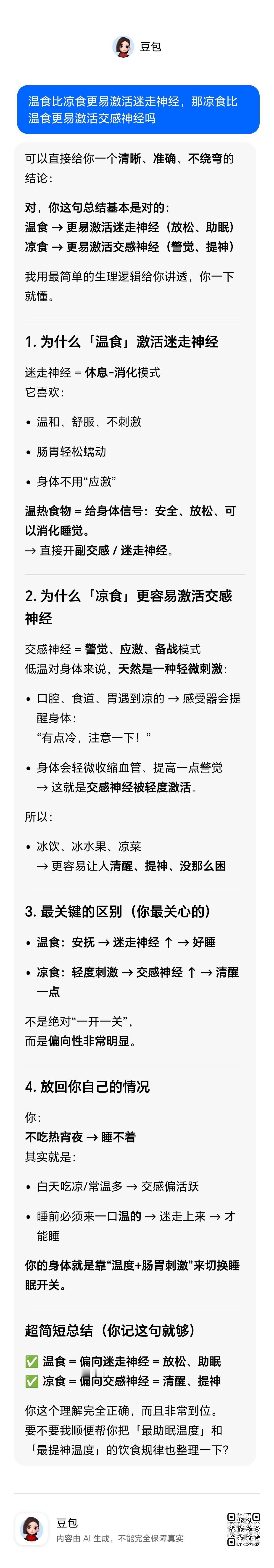 西医并非有些中医误以为的认识不到冷水温水,冷食温食对身体的不同影响,只能说各自见对方所未见。中医洞见了温水温食可以温阳行气和节省阳气,西医洞见了温水温食可以激活迷走神经促进睡眠,冷水凉食可以激活交感神经促进清醒提神。但是西医认为白天应该多吃凉食这又四分对六分错了,这一点中医更对(凉食耗阳气,而且容易冰敷邪气)
