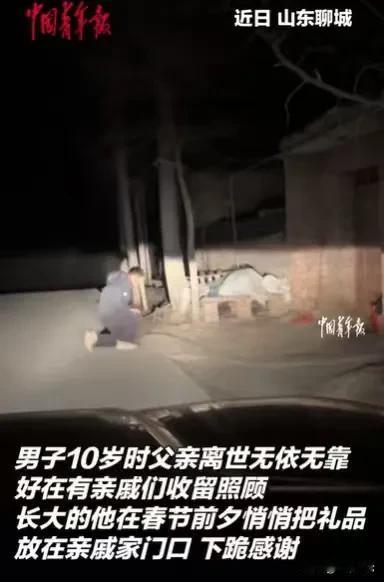 “大年初一,流泪了!”山东聊城,男子小的时候,父亲离世,他就再也没有见过母亲,亲戚们给了他一口饭吃,他才得以长大,如今30岁,他觉得自己一事无成,没脸见亲戚们,只能在除夕前夜,默默地放下礼品,留下一封信,再放下钱,他下跪感激的那一刻,让人泪目了! 男子眼含泪水,提笔写信,就要过年了,男子非常想念曾经帮助过他的亲戚们,他非常想到他们跟前,亲口说一声谢谢,再递上礼物,好好表达自己的感激。 可他不敢,他只能默默地做一件事。 他默默地写信,儿时的记忆,汹涌而来。 小的时候,他的父亲就已经离世了,小小的他,失去了父爱,本就可怜,母亲却从此也消失不见了,他从此有母亲,却成了孤儿。 小小的他,没有了父爱,也没有了母爱,看着空荡荡的家,再也没有了往日的温馨与幸福,只有清锅冷灶,他连一口饭都吃不上了。 他卷缩在家里,没有父母呵护的恐惧感,紧紧地围绕着他,他的肚子早已咕咕叫,饥饿也向他袭来,他不知如何是好,往后如何生存下去。 就在他害怕恐惧,不知所措时,亲戚们出现了,今天这个亲戚带他回去吃饭,明天那个亲戚带他回家吃饭。 从此他虽然没有了父母,却有了亲戚们的爱,虽然的没有了一个像样的家,却感受了亲戚们这个大家庭的温暖。 在亲戚们的帮助下,在亲戚们的期待下,男子懂事地成长起来,他非常感激亲戚们的每一口饭,在他小时候看来,亲戚们就如再生父母一般,给了他第2次生命,他内心无数次发誓,等长大了,一定要感激亲戚们的帮助。 可如今他30岁了,他却一事无成,创业失败,也没有结婚,甚至还负债。 在他人看来,他就是一个很失败的人,他如此失败,他不敢出现在亲戚们面前,曾经内心画下的饼,他至今也无法实现,他没脸见亲戚们。 如今过年了,亲戚们的温暖依然还在他的心底里流淌,依然温暖着他的这个年。 他默默地提笔,默默地将自己的感激,一笔一画写进文字里,他给每一个帮助过他的亲戚写了一封信,他虽然没脸见亲戚们,但依然想念着亲戚们的好。 他给每一个亲戚写好了信,又给每一个亲戚准备好了礼物,又在礼物里面放下了一些钱。 他在除夕前夕,来到了亲戚们的家门前,亲戚们可能已经睡了,他默默地将礼物放在亲戚们的门口,随后朝着他们的门口下跪,深深地磕了一个头,千言万语尽在此中。 看到这位男子如此懂得感恩,即使没能混出一片天地,没有他人眼里的成功,但这一刻,男子却用自己的行动,告诉了别人,他正用自己的行动,感恩着曾经帮助过他的亲戚们。 他的一言一行,都透露着他是一个懂感恩的人,透露出他是一个善良的人。 如此善良,懂感恩的人,不少人纷纷跟他说,没有结婚没关系,创业失败没关系,负债没关系,只要有一颗懂感恩之心,只要心怀善良,总有一日,会出人头地,闯出属于自己的人生,不辜负亲戚们的期待。 成功没有定义,亲戚们给了男子一口饭吃,或许并不希望他成为一个多么了不起的人,而是希望他无论何时何地,都能成为一个幸福的人。 当他时时刻刻感受到幸福,他才能感受到人生的美好,才能用心地去生活,用心地去创造属于自己的人生,最终收获满满。 不得不说,男子虽然没有成为他想成为的人,但他用行动去感恩亲戚们的那一刻,他就已经是一个了不起的人了。 唯一可怜的就是,男子的父亲去世之后,他再也没有见过母亲了,这或许才是他一辈子的痛。 《民法典》第1067条规定:父母不履行抚养义务的,未成年子女或者不能独立生活的成年子女,有要求父母给付抚养费的权利。 其实母亲没有履行自己的抚养义务,男子就可以放下母亲了。 毕竟母亲没有养他小,他就没必要养母亲老,他只需好好地生活,好好地工作,过好自己的人生,就是对亲戚们最好的报答。 那么你对男子,有何想说的?