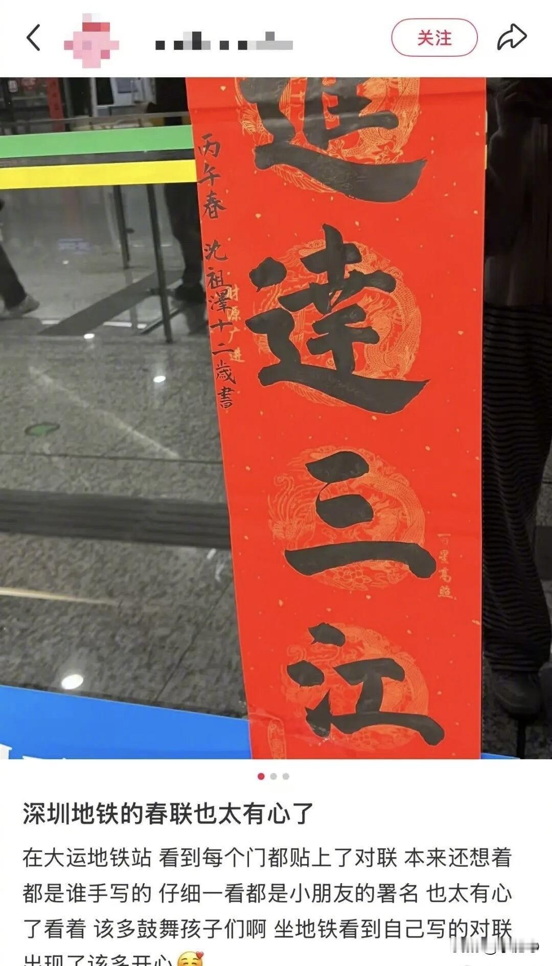 最近深圳地铁因为一批春联直接火上热搜,不少市民坐车时突然发现,多个站点的屏蔽门两侧都贴上了手写春联,红底黑字满满都是年味,让原本快节奏的通勤路一下子温柔起来,很多网友都说,一上车就被治愈了,这才是过年该有的样子。更让人惊喜的是,大家仔细一看发现,这些春联里有不少字迹带着稚嫩感,笔画可爱又认真,一看就不是专业书法家的手笔,有眼尖的网友直接认出,这分明是小朋友写的,消息一出来,评论区瞬间被温暖刷屏,大家都在夸深圳地铁太会搞氛围了。更让人惊喜的是,有眼尖的网友发现,这些春联里藏着不少“小朋友笔迹”,笔画带着稚气,有的工整有的可爱,落款还写着十一岁、十三岁等字样,一看就是孩子们认真书写的作品,消息一出来,全网都在夸深圳地铁这波操作太走心。这些充满童真的春联,来自深圳地铁举办的市民手写春联活动,除了地铁工作人员精心创作,还专门邀请了中小学生参与,孩子们一笔一画写下祝福,没有印刷体的刻板,全是最朴素真诚的新年心意,被贴在人来人往的地铁里,让每一个路过的人都能沾到喜气。在很多人印象里,地铁站是高效、冰冷的都市空间,行色匆匆的人们只顾着赶路,很少停下感受细节,而这些小朋友写的春联,就像城市里的小温暖,把年味和人情味一起带进了公共空间,让团圆的气氛变得触手可及。话题发酵后,网友们纷纷点赞留言,有人说这才是过年该有的样子,有人夸小朋友字写得棒,还有人表示,一座城市的温度,就藏在这些不起眼的小细节里,比起华丽的装饰,这种来自普通人、尤其是孩子的祝福,更能打动人心。深圳地铁这波操作没有花里胡哨的设计,却凭借满满的真诚圈粉无数,用最接地气的方式传递年味,让小朋友的创意与心意被看见,也让奔波在路上的人们感受到实实在在的温暖,这样的年味不喧闹、不刻意,却足够温柔,足够让人记住,也让大家明白,最好的新年氛围,从来都是用心创造出来的。