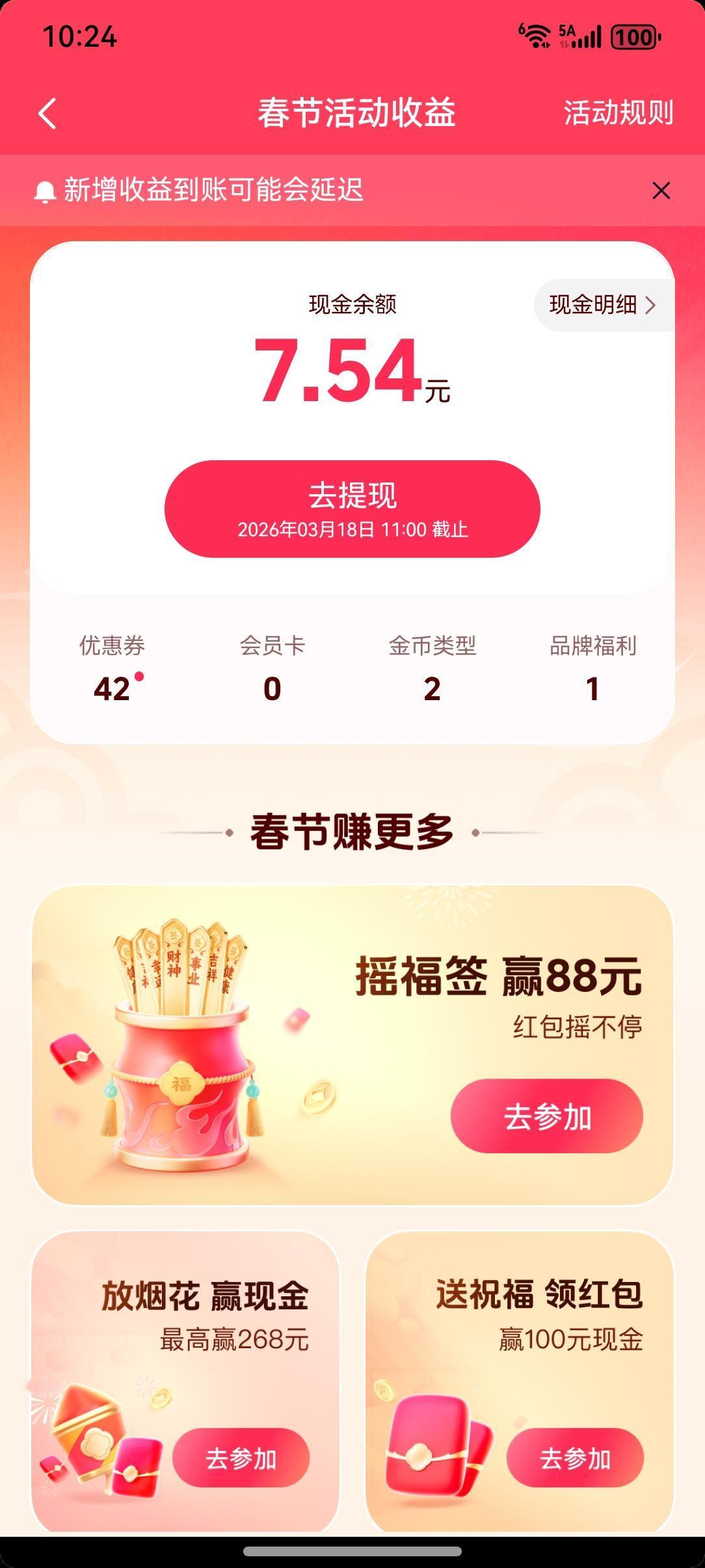 今天是大年初一,新春佳节!祝各位友友们新春快乐!万事如意!心想事成!昨天晚上战绩辉煌,各大平台红包拿到了手软 支付宝:10.08元 快手:7.16+58.28=65.44元 抖音:7.54元 百度:3.06元 元宝:三轮提现14.39元 千问:3.66元 豆包:三轮红包雨1.66+1.08+1.88+1.88=6.5元 七个平台共计拿到10.08+65.44+7.54+3.06+14.39+3.66+6.5=110.67元,个人感觉还是不错的,大家都参加了吗?春节活动集卡