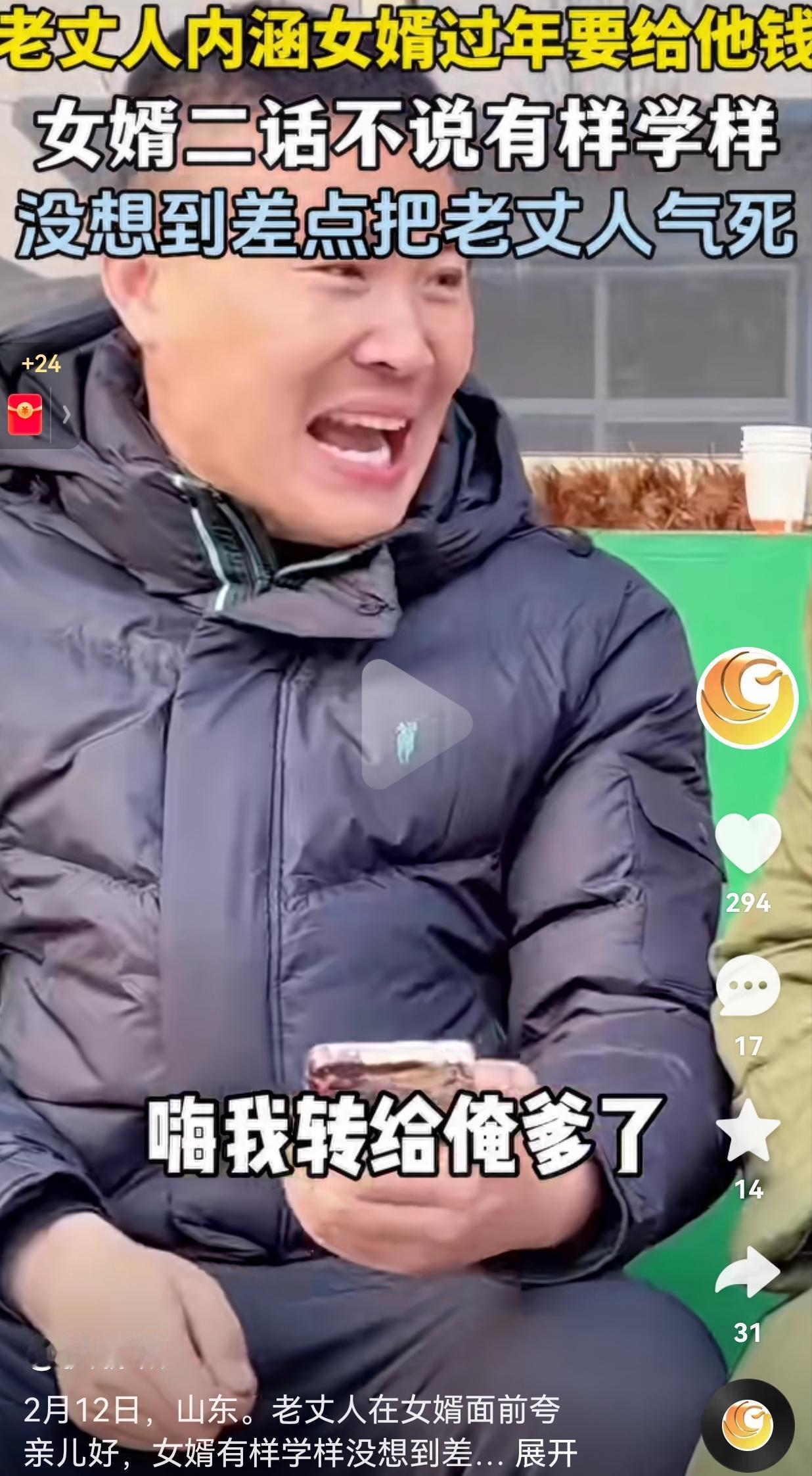 笑不活了!2月12日,山东聊城一段家庭日常视频,把网友笑得前仰后合,笑完之后,却又让无数人红了眼眶。 视频里,老丈人穿着军绿色的厚棉袄,坐在院子里,手里攥着手机,对着身旁的女婿一脸得意地开启了炫耀模式:“这过年了,还是亲儿好啊,俺儿给我转了三千块钱,说让我买衣服,多买点好吃的。” 这话听得人心里门儿清,哪里是单纯夸儿子,分明是话里有话地“内涵”女婿,明晃晃地暗示他也该有所表示了。 女婿坐在一旁,听着这话半点尴尬都没露,反而立马掏出手机,手指飞快地在屏幕上戳着,一本正经地接话:“那我也得转,我得转六千!” 老丈人一听,眼睛瞬间亮了,嘴角直接咧到了耳根,手里的手机都攥紧了,满心期待着那句“爸,您收着”。 可下一秒,女婿笑着摊开手机屏幕,轻飘飘补了一句:“转过去了,给我亲爸了。” 老丈人脸上的笑容瞬间僵住,愣了几秒才拿起自己的手机反复翻看,满脸疑惑又带着点委屈:“我咋没收着?” 女婿看着他的样子,笑得更欢了,理直气壮地回:“同样是当爹的,我不能让俺爹比你差啊!” 这一句话,直接把老丈人整得哑口无言,手指着女婿,半天憋出一句“你去你……”,那又气又无奈的样子,让旁边人都忍不住笑出了声。 网友看到后评论说:“这女婿是真懂有样学样,亲儿给三千,他给亲爸六千,主打一个公平公正,老丈人算是遇到对手了!” 也有的网友说: “老丈人:我本想套路女婿,没想到被女婿‘反杀’,血压当场飙上去了。” 还有的网友说:“太真实了!我爸过年也总跟我夸别人家孩子给多少红包,我直接回‘那你先给我涨点压岁钱,我爸当场就沉默了。” 我们总调侃“过年就是过钱”,可这看似玩笑的金钱较量背后,藏着多少中国式家庭的小心思,又藏着多少不被说破的小期待? 老丈人炫耀儿子给的三千块,真的是缺那点钱买衣服、买好吃的吗?未必。他不过是想在女婿面前“争口气”,证明自己的孩子孝顺,更想看看女婿心里有没有他这个长辈,能不能给足他这份重视。 而女婿转六千给亲爸,也不是故意气老丈人,不过是在这场无形的“孝顺比拼”里,不想让自己的父亲落了下风,想给自己的爸妈争一份体面。 可我们都在这场较劲里,渐渐忘了最本质的东西——孝顺从来不是比谁转的钱多,而是谁把谁真正放在心上。感情从来不是数字的较量,而是用心的陪伴。 就像视频里的老丈人,如果女婿当时不是用反向操作应对,而是笑着对他说:“爸,您儿子给您转三千,我给您转六千。不过这钱咱别存着,明天您陪我去买年货,我拎东西,您挑喜欢的,咱爷俩好好逛一天,晚上再喝两盅。” 我想,老丈人一定会笑得比听到转账时更开心。因为他要的从来不是那六千块钱,而是被女婿重视、被家人惦记的温暖。 话说,今年过年,你给父母转了多少红包,买了多少礼物?