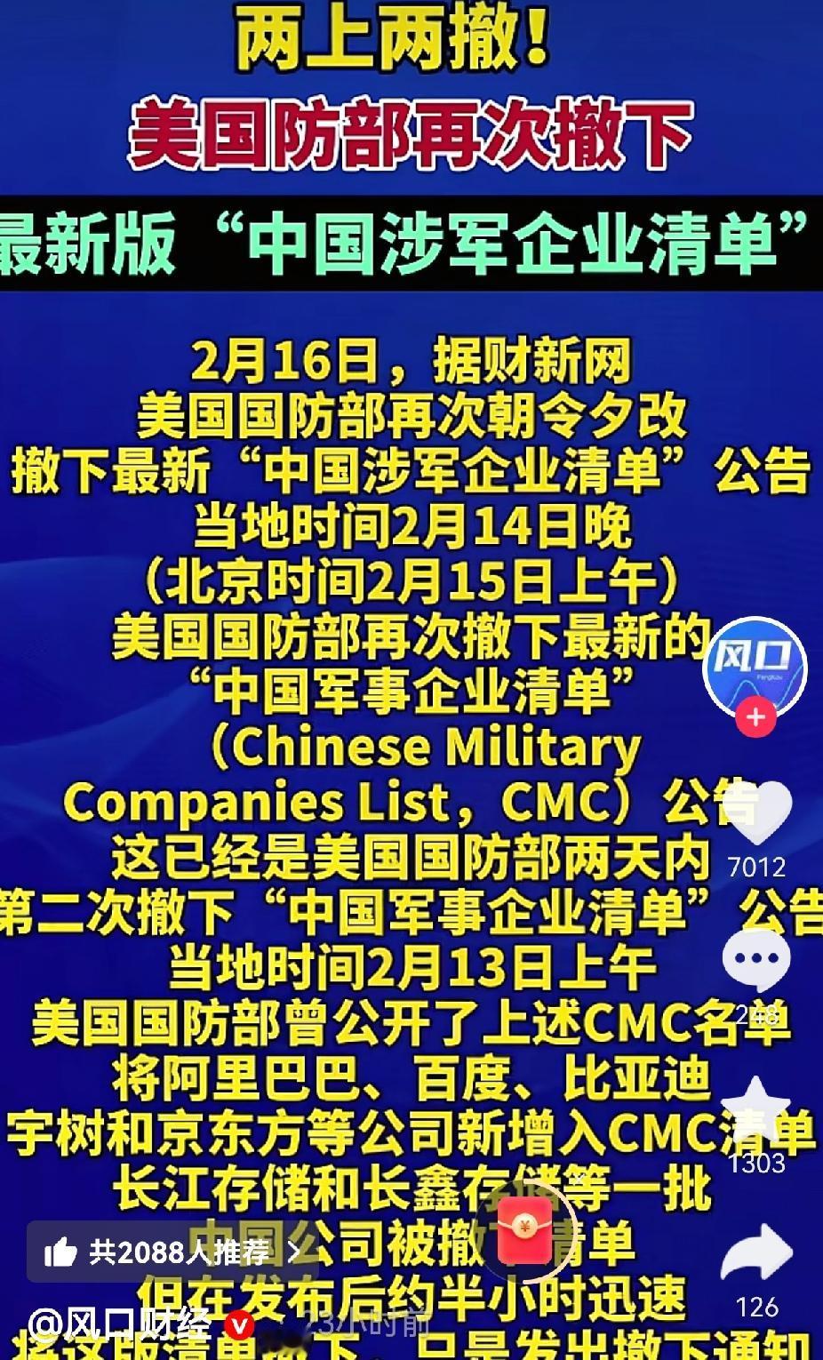 两上两撤 这是玩哪出? 美国发的中国企业黑名单,13号上午发了一次,半小时就撤了,15号又发一次,结果今6号又给撤了。 这操作,我也是看呆了。 这反复横跳的,到底是几个意思? 我感觉可能跟川子4月份要访华有关,提前做点姿态? 评论区有人说这是"欲擒故纵"! 不过话说回来,这种反复无常的操作,也反映出他们内部意见不统一,自己人都没商量好就往外扔东西,扔完又往回捡,真是让人无语。