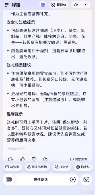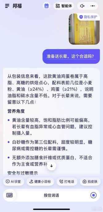 春节在家教爸妈用阿福一看我爸妈买的年货,我就知道为啥他俩能凑齐三高了。我爸高血压高血糖,我妈高血脂,结果买的不是沙琪玛,就是曲奇饼干、黄酒鸡蛋、旺仔牛奶。。。教他们用阿福的第一课,就从鉴别哪些年货他们不能吃开始