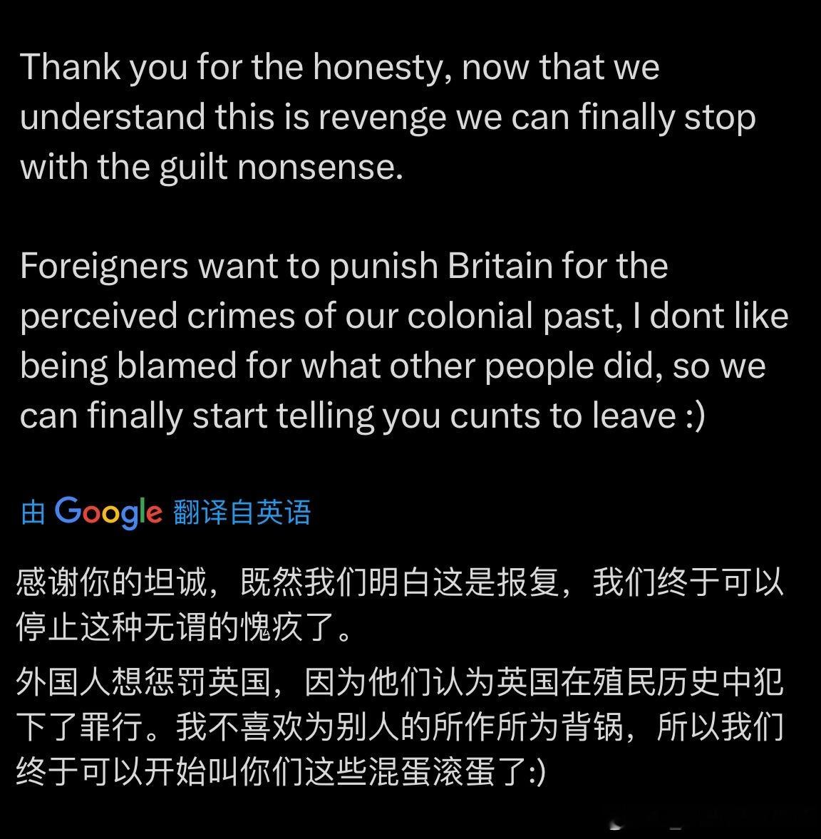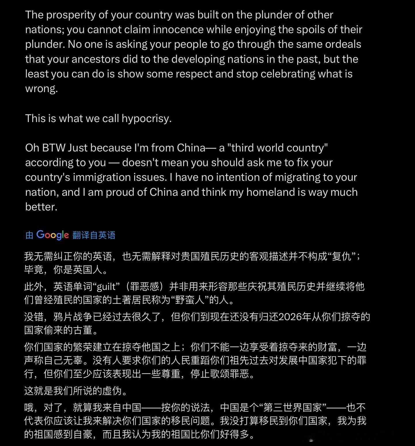 我:“你个英国人还需要我教你英语吗?你懂英文单词‘复仇’和‘罪恶感’的意思吗?客观提及你们国家的殖民历史就是复仇了?你张嘴闭嘴野蛮人、第三世界,你哪里有罪恶感了?你们国家的繁荣是建立在剥削、殖民他国之上的,你也是受益者。都百年了,也没见你们把大英博物馆的文物还回来,这也证明你们这代人依然不思悔改吧。”