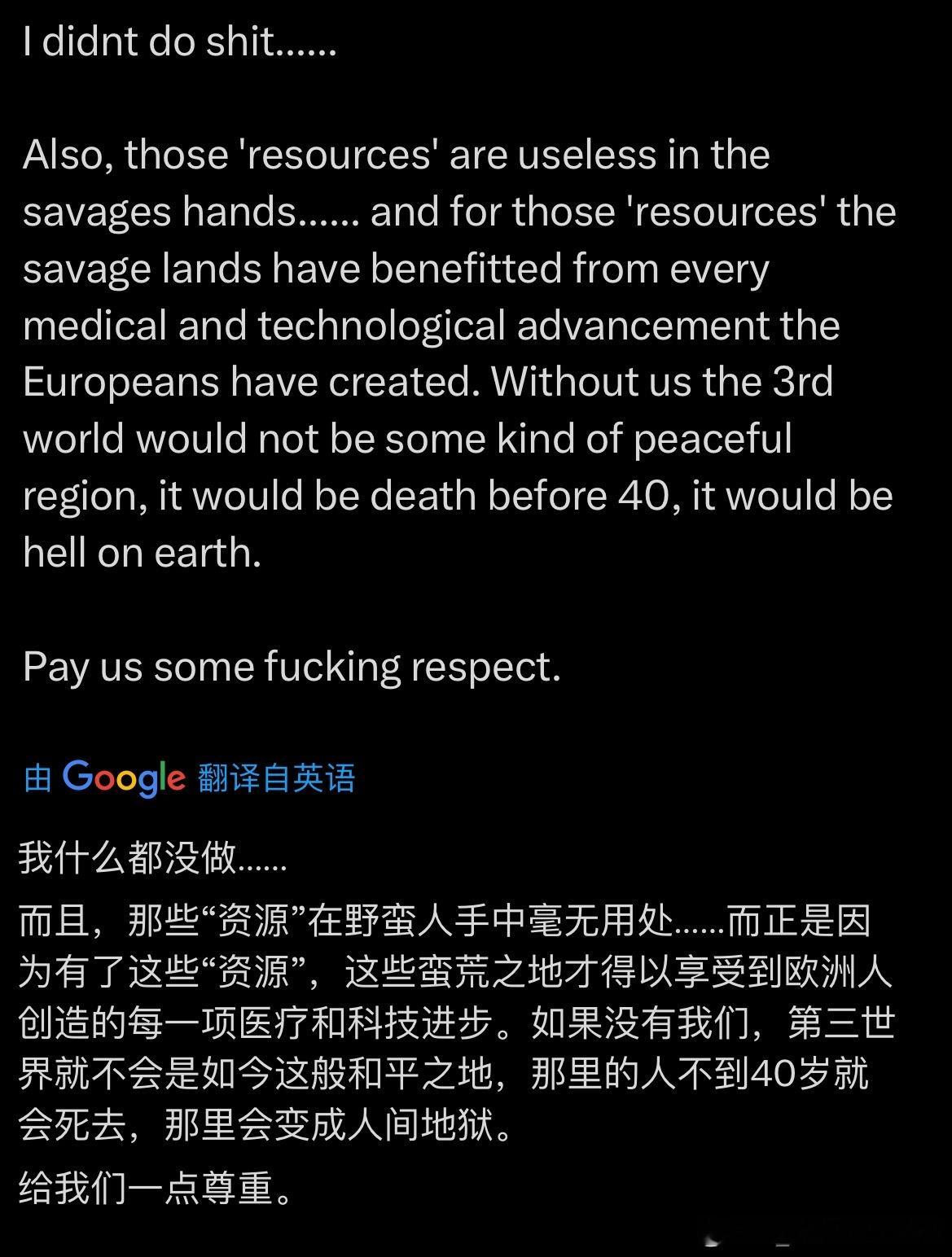 英国大哥:“那是我这代人做的吗?你提这段历史是要复仇是吧?那好,我没心理负担和罪恶感了。你们这些第三世界的野蛮人,如果没被欧洲人殖民,你们都活不过四十岁。你们的资源在我们手里才更有意义。”