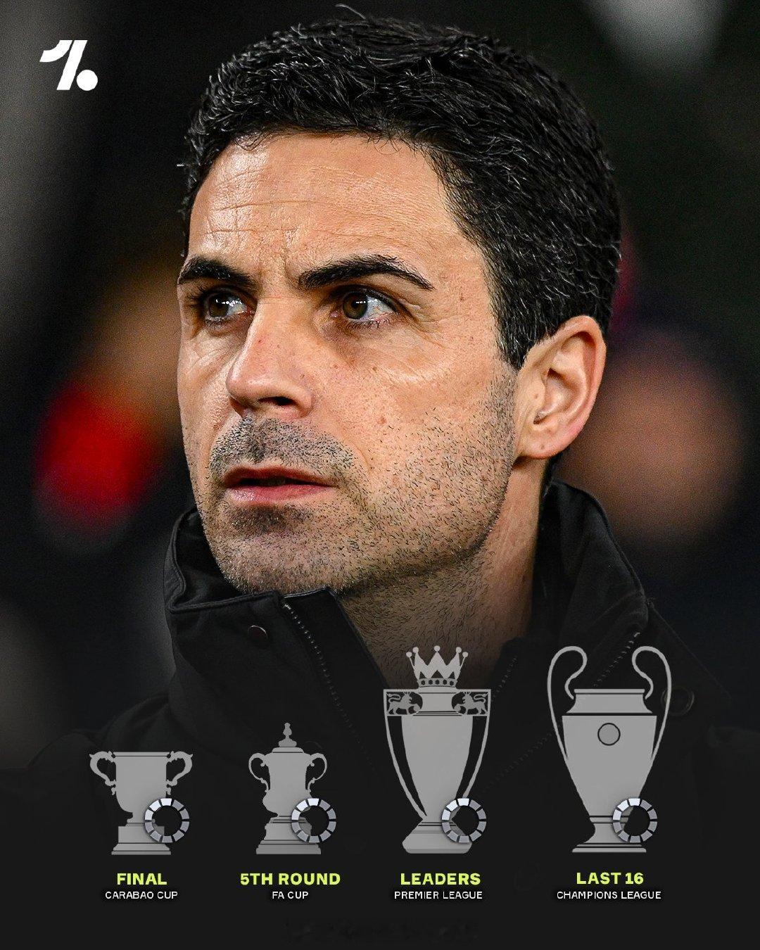 【四冠王美梦】来到2月中旬,阿森纳依然保持四线作战,力争四冠王:英超联赛榜首,欧冠直接晋级16强,足总杯晋级第5轮,联赛杯晋级决赛,阿尔特塔迎来执教枪手6年多以来最重要的赛季冲刺。