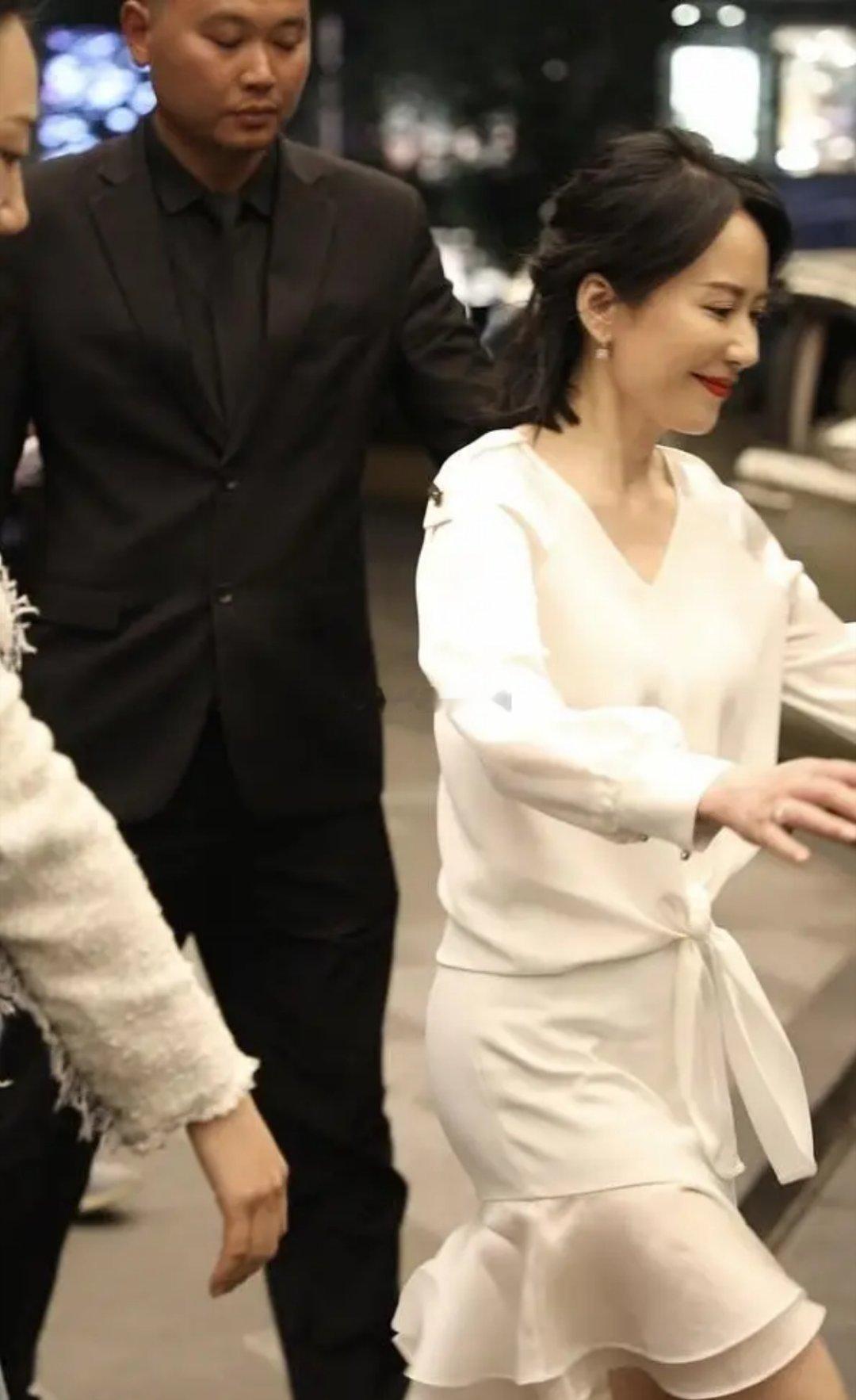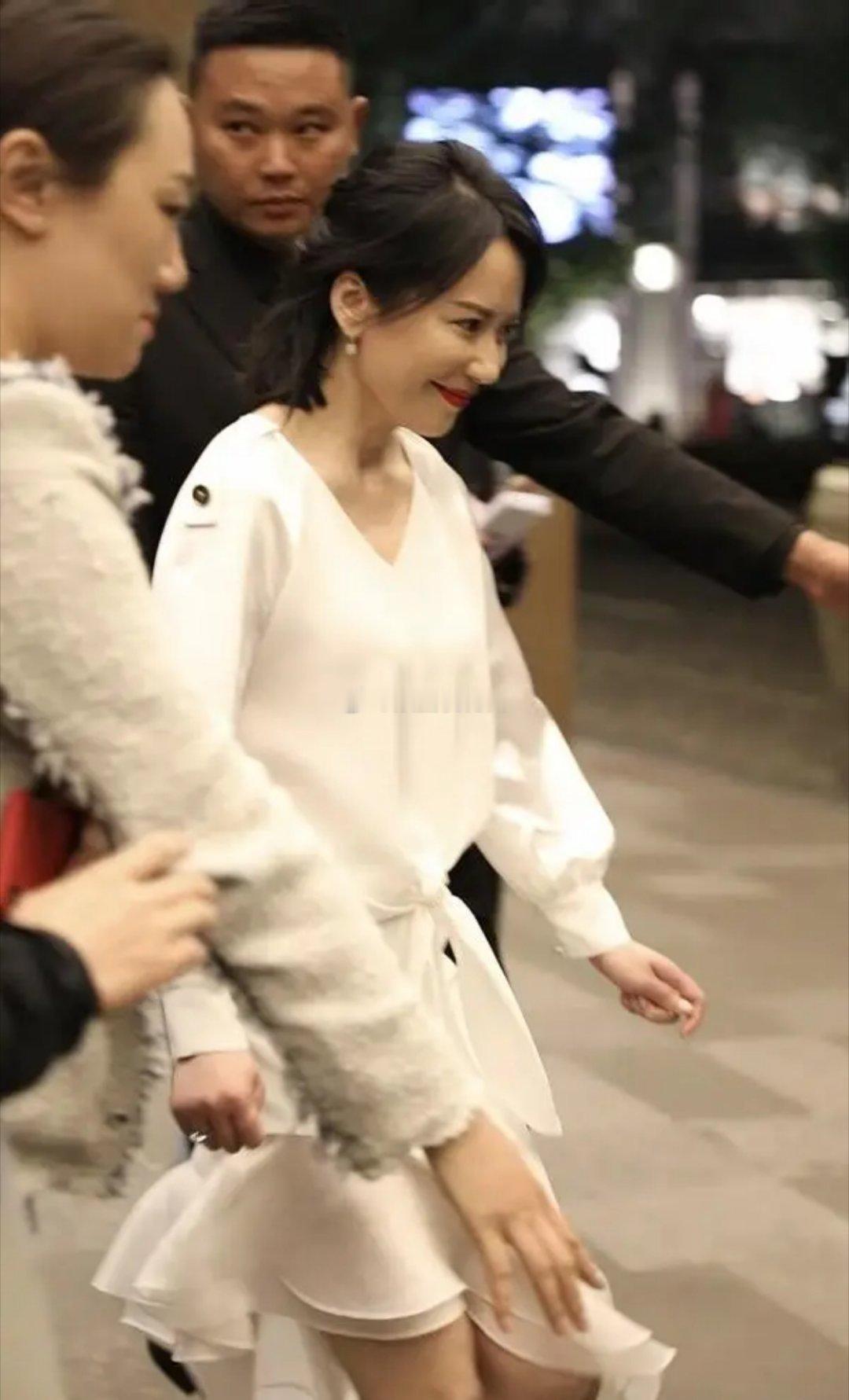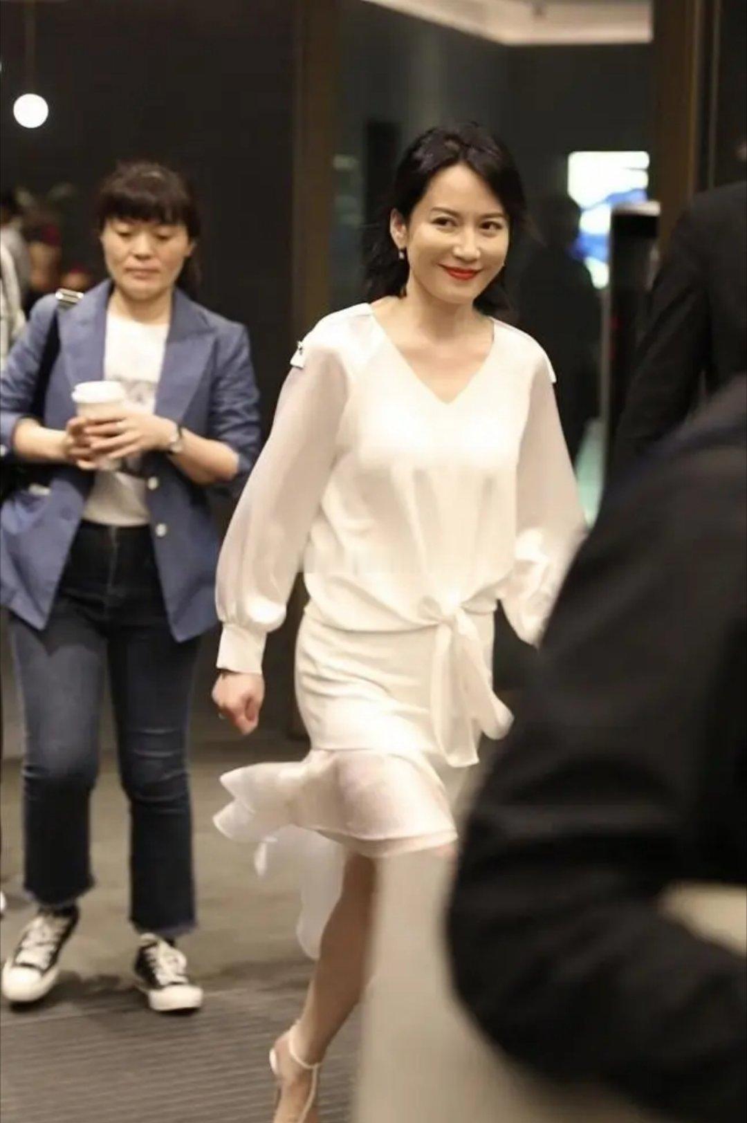 俞飞鸿一袭不规则白裙勾勒出纤细身材,低头浅笑间眼波流转,温柔气质如月光般漫开,举手投足皆是从容韵味。