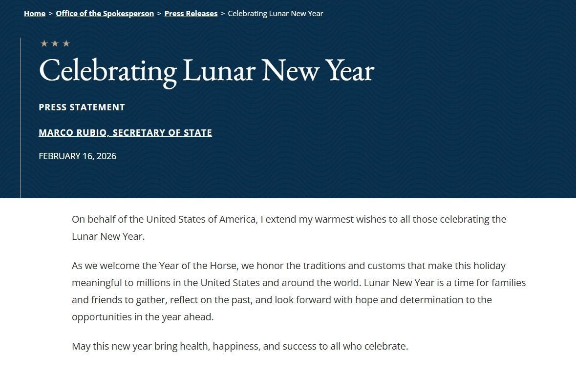 【#鲁比奥拜年#】2月16日农历除夕,美国国务院网站发布了国务卿鲁比奥关于“庆祝农历新年”的公报。