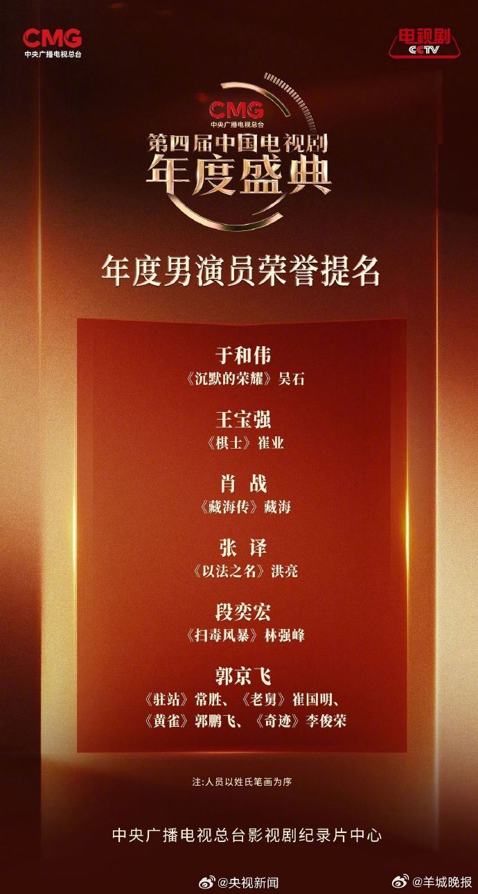 【#年度男演员荣誉提名#】#CMG中国电视剧年度盛典##中国电视剧年度盛典荣誉提名# 关注,今晚八点档揭晓!#红包##惊蛰无声##央妈不会找王一博赔地板吧##王一博郭富城 坚持手搓##沈腾 说错词#(央视新闻)(编辑:郑宗敏;审签:周乐瑞)