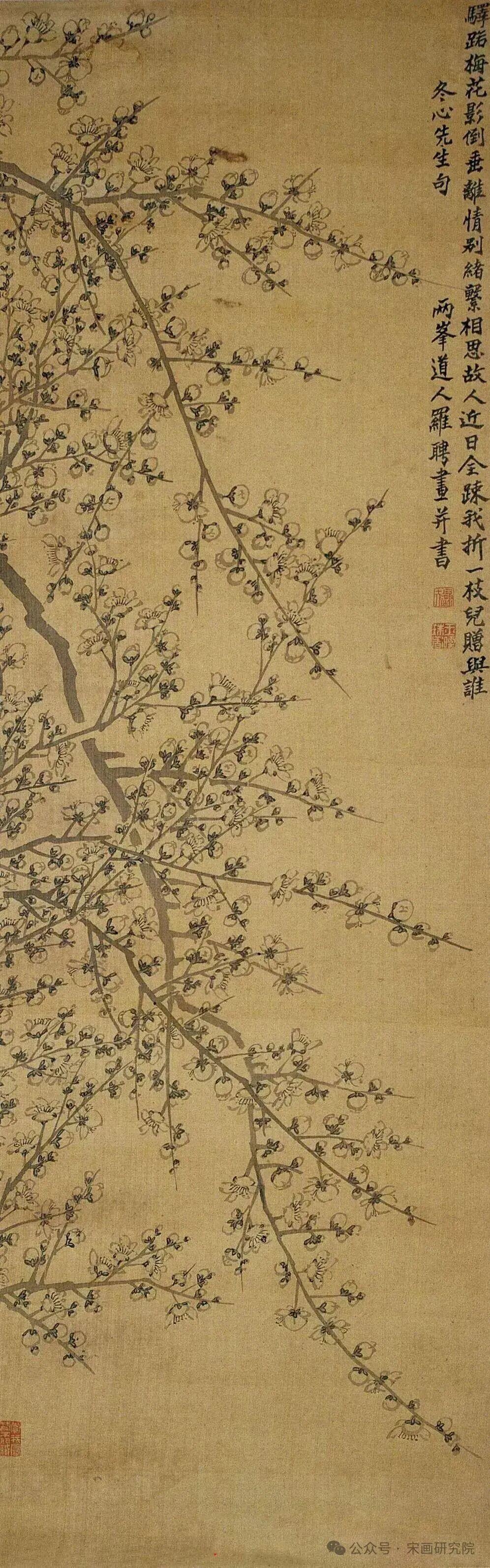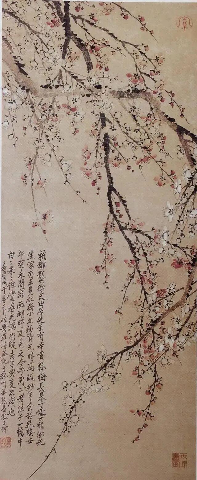 罗聘画梅,真是把“奇”与“韵”揉到了骨子里。你看他那倒挂的梅枝,不按常理出牌,偏要从高处垂落,像把寒冬里的劲儿都拧成了一股绳,横斜里带着股野趣。指画更是绝,指甲勾的瓣边脆生生的,指腹擦的枝干又带着温厚,刚柔一撞,倒把梅花的精气神全逼出来了。 早年学金农,后来却画出了自己的暖。别家画梅多是孤高自赏,他偏添几分人间气,驿路野梅也好,红白同枝也罢,墨晕里裹着香,线条里藏着热,倒像是把文人的风骨,化作了能摸得着的温度。难怪说“梅能写其香”,他哪是画梅,是把心里的那点执拗与温情,全种进了笔墨里啊。 集卡领红包