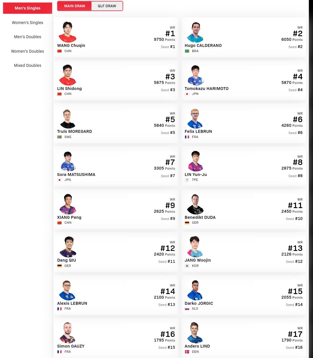新加坡大满贯赛男女单各16位种子选手确定。 男单种子排序是: 王楚钦、雨果、林诗栋、张本智和、莫雷加德、小勒布伦、松岛辉空、林昀儒、向鹏、杜达、邱党、张禹珍、大勒布伦、达科、西蒙高茨、林德。 亚洲七名、欧洲八名、美洲一名。 女单种子排序是: 孙颖莎、王曼昱、陈幸同、朱雨玲、蒯曼、张本美和、王艺迪、陈熠、伊藤美诚、早田希娜、桥本帆乃香、大藤沙月、申裕斌、石洵瑶、温特、长崎美柚。 亚洲十五名、欧洲一名。
