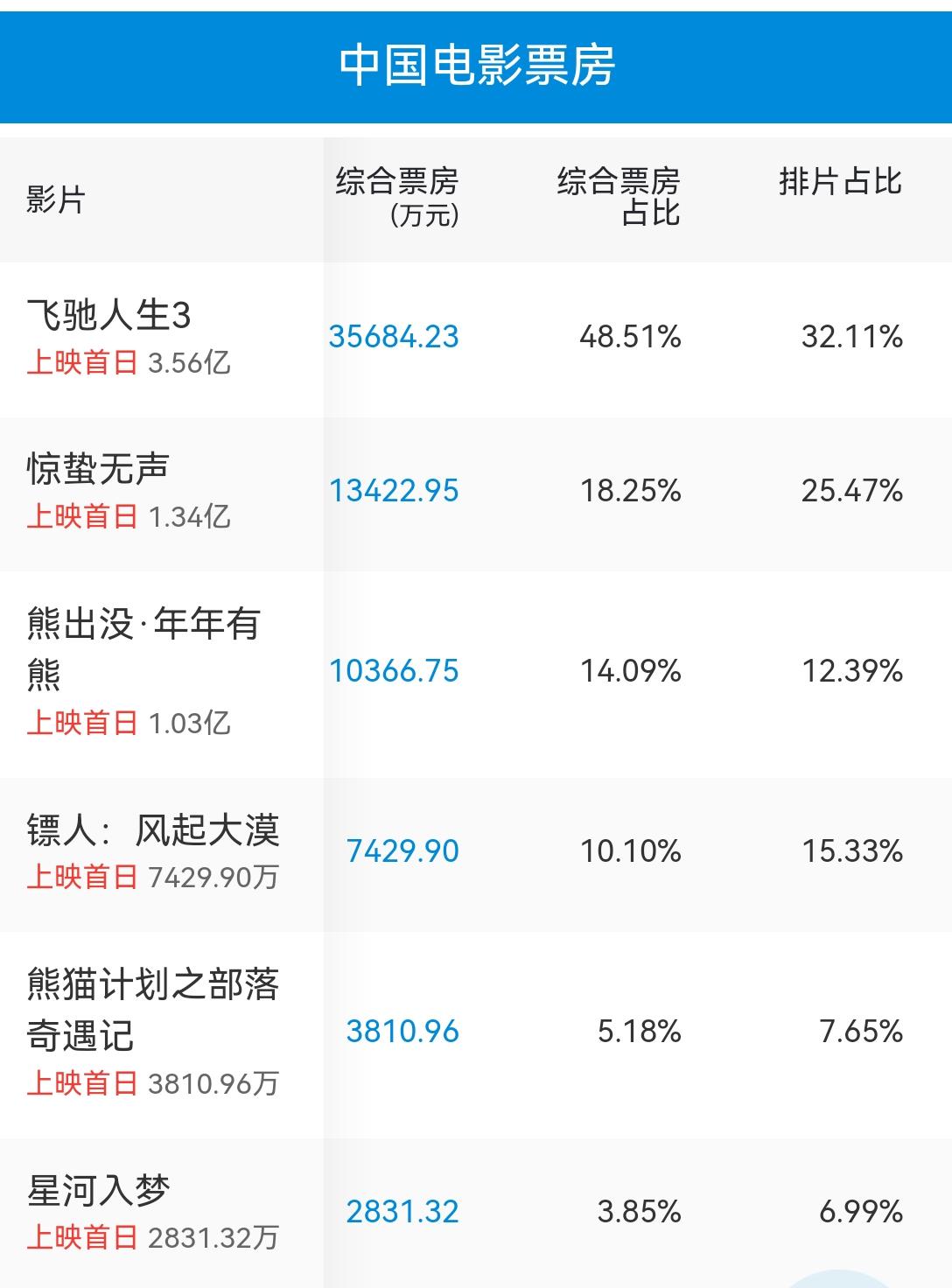 春节档电影“预售”这么久,终于“开画”[吃瓜群众]目前,《飞驰3》有一骑绝尘之势[6]其他,除了“🐻出没”市场稳定外,都是票房明显低于排片… [思考]有一说一,某些片指望靠“当红女配”来“硬扛”,怕是…不可能的吧[捂脸]