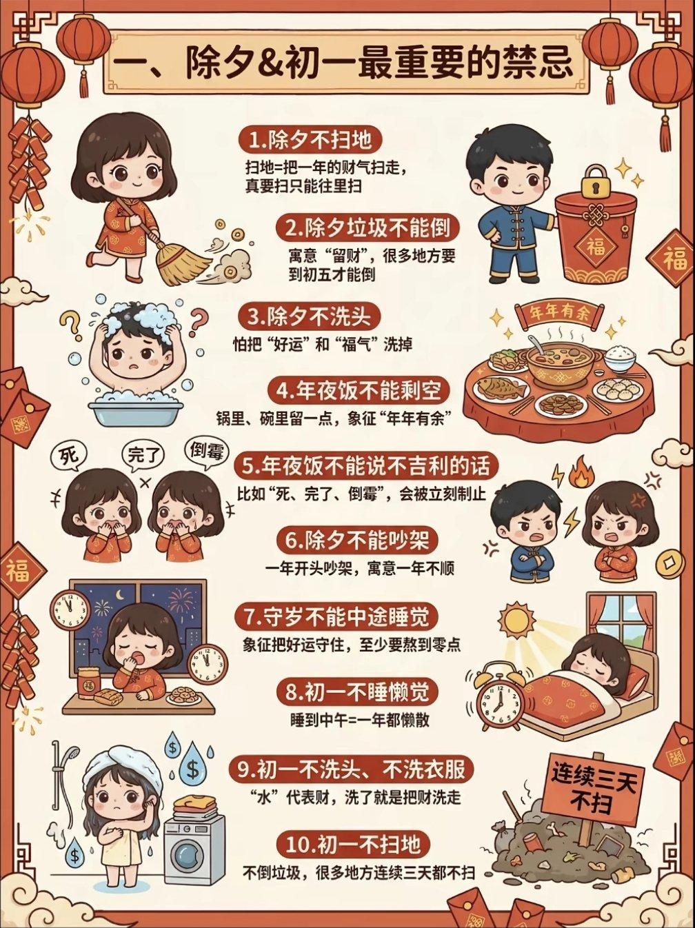 大年初一,朋友圈里突然被一条温馨提醒刷屏了:“别扫地,别泼水,留住一年的福气!”这看似简单的几个字,背后却藏着满满的传统文化和老辈人的智慧,让人忍不住想一探究竟。 说起大年初一不扫地、不泼水的习俗,那可是由来已久,全国各地几乎都有这样的讲究。老辈人认为,大年初一是迎福纳祥的好日子,这一天,家里的每一个角落都可能藏着财神爷撒下的“金元宝”,地上的垃圾、灰尘,那可不是脏东西,而是“财气”“福气”的象征。要是这时候拿起扫帚一扫,或者往外泼水,那不就把好不容易迎进门的财气、福气都给扫走、泼没了吗?想想都让人心疼! 记得小时候,每到大年初一,奶奶总是早早地起床,把家里布置得喜气洋洋,然后反复叮嘱我们:“今天可千万别扫地,别泼水啊!”那时候不懂,觉得奶奶就是迷信,现在长大了,才慢慢明白,这其实是老辈人对美好生活的向往和期盼,他们用自己的方式,守护着这份来之不易的幸福和安宁。 现在生活条件好了,大家可能不再那么迷信这些习俗,但是,大年初一不扫地、不泼水的传统,还是被很多人保留了下来。为啥呢?我想,这不仅仅是对传统文化的尊重和传承,更是一种对家的眷恋和守护。想象一下,大年初一,一家人围坐在一起,吃着团圆饭,聊着家常,哪怕地上有点碎屑、有点灰尘,也觉得那是温馨的象征,是幸福的痕迹。何必非要在这个时候拿起扫帚,打破这份宁静和和谐呢? 就算真的觉得家里有点乱,想打扫一下,也没关系。老辈人还给我们留了个“后手”——从外往里扫,把财气、福气都扫到家里面来。这样一来,既满足了打扫卫生的需求,又遵循了传统习俗,岂不是两全其美? 至于泼水嘛,那就更简单了。大年初一,咱们就尽量别用水,洗衣服、洗澡这些都可以暂缓一下。如果实在需要用水,也记得别往外泼,往屋里洒洒水,寓意着“财源广进”,也是挺有意思的。 大年初一不扫地、不泼水,不仅仅是一种习俗,更是一种文化、一种情感、一种对美好生活的向往和期盼。咱们不妨就顺着老辈人的心意,在这一天,放下扫帚、收起水盆,和家人一起享受这份难得的宁静和温馨吧!初一守福指南 来源:国是直通车