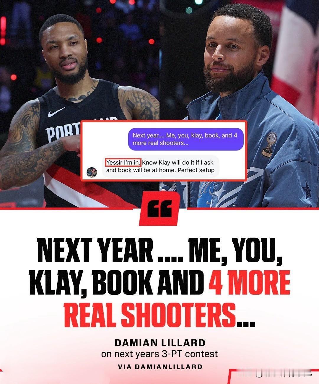 约战,射手的天花板对决? 利拉德公开与库里的私信內容,相约明年全明星三分大赛! 利拉德:明年…我,你,克莱,布克,再来4个纯射手,直接拉满火力。 库里秒回:我加入。只要我开口,克莱必定会来,布克就在主场。这将是天花板级别的完美对决。 利拉德已拿下3届全明星三分大赛冠军、库里2届、克莱和布克各1届,明年如果凑齐4大冠军对决,将吸引球迷无数的眼球。 猜猜谁将会是三分大赛的王中王?