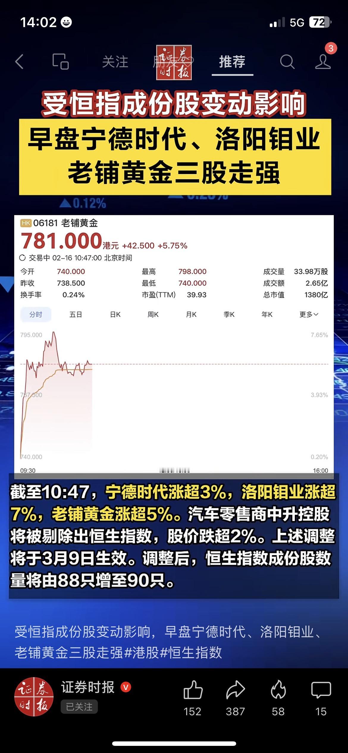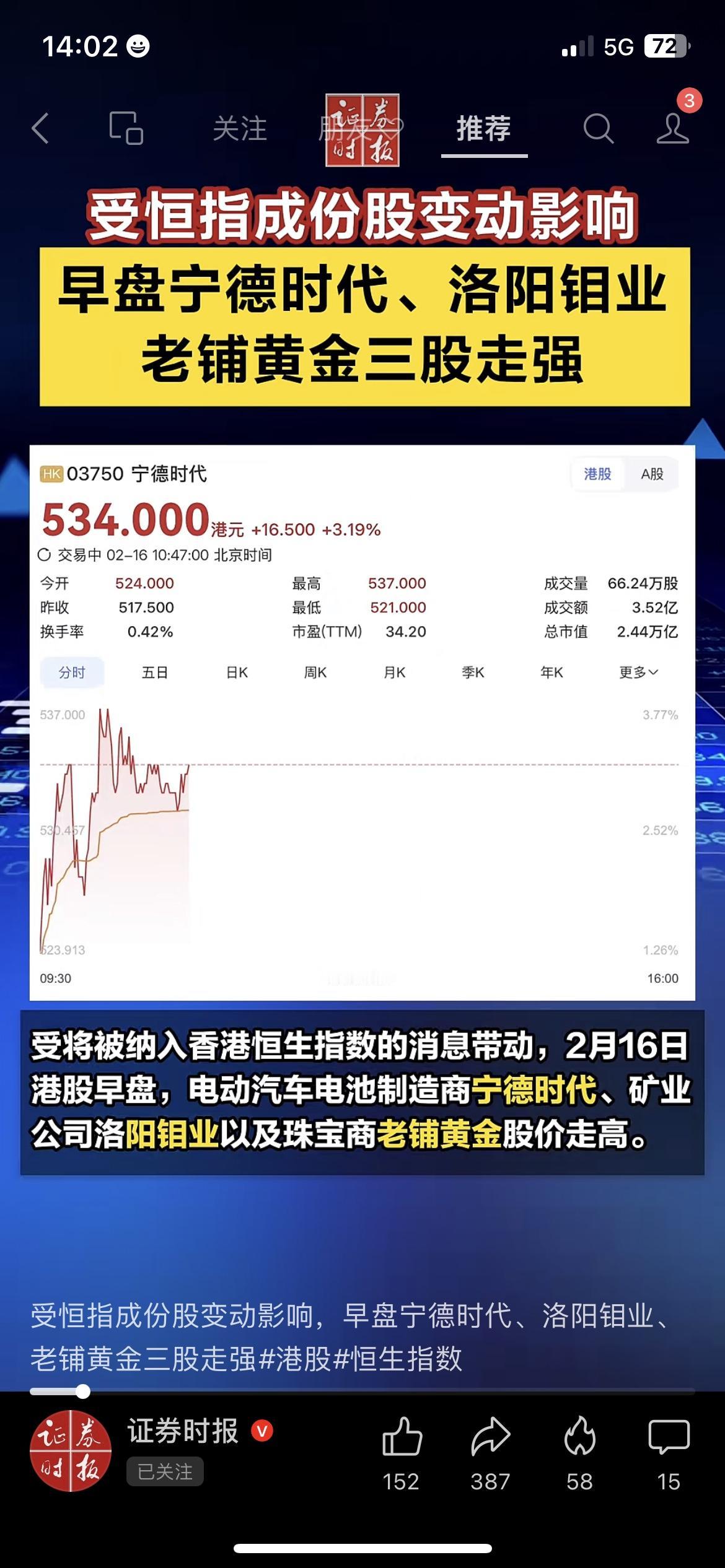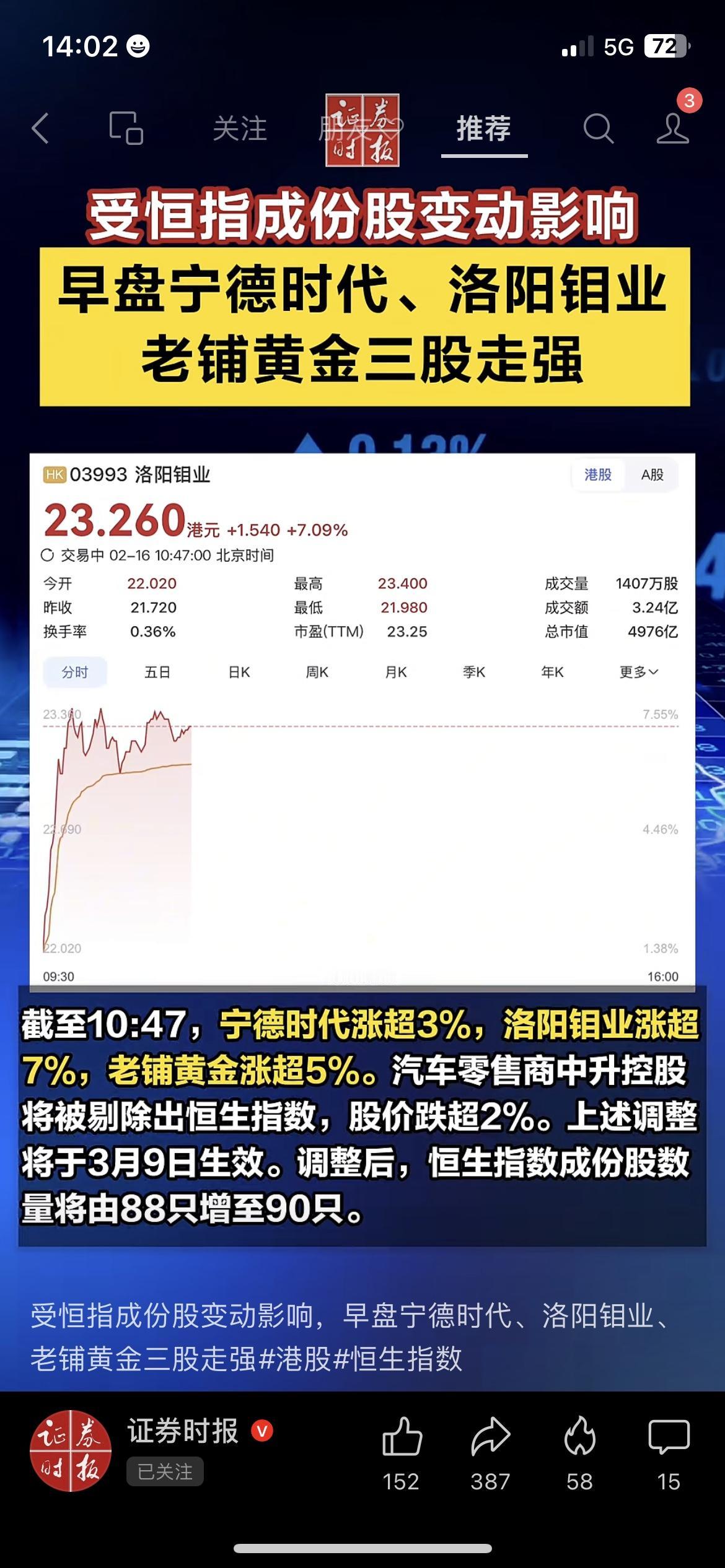 恒生指数成份股调整在即,相关个股提前异动!宁德时代、洛阳钼业、老铺黄金纷纷走强。 被纳入指数,往往意味着被动资金配置预期,这是很多资金喜欢做的预期差机会。 但也要清醒:市场有风险,投资需谨慎,预期兑现后容易回落,别盲目追高。 你会埋伏指数调整概念股吗? 港股 恒生指数
