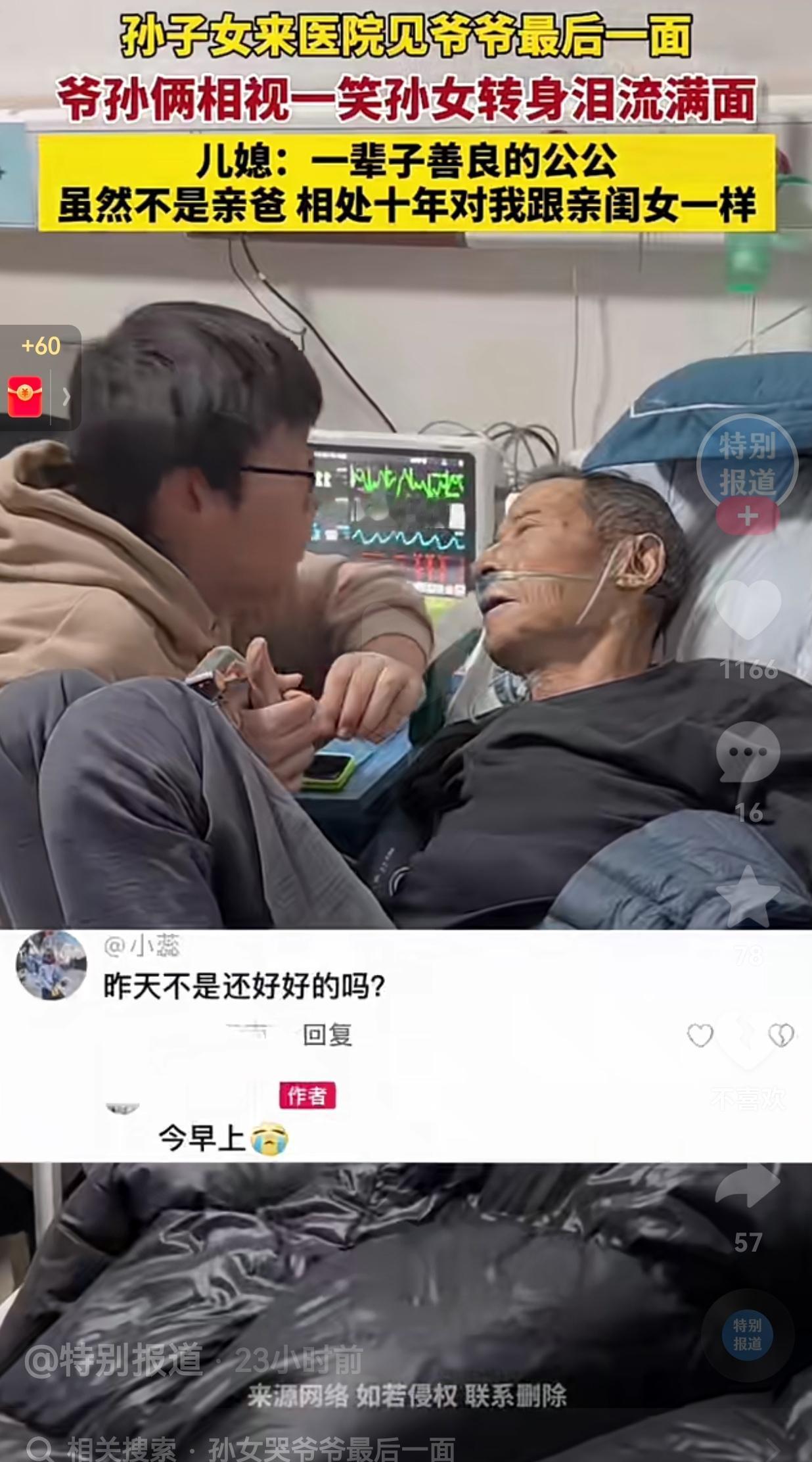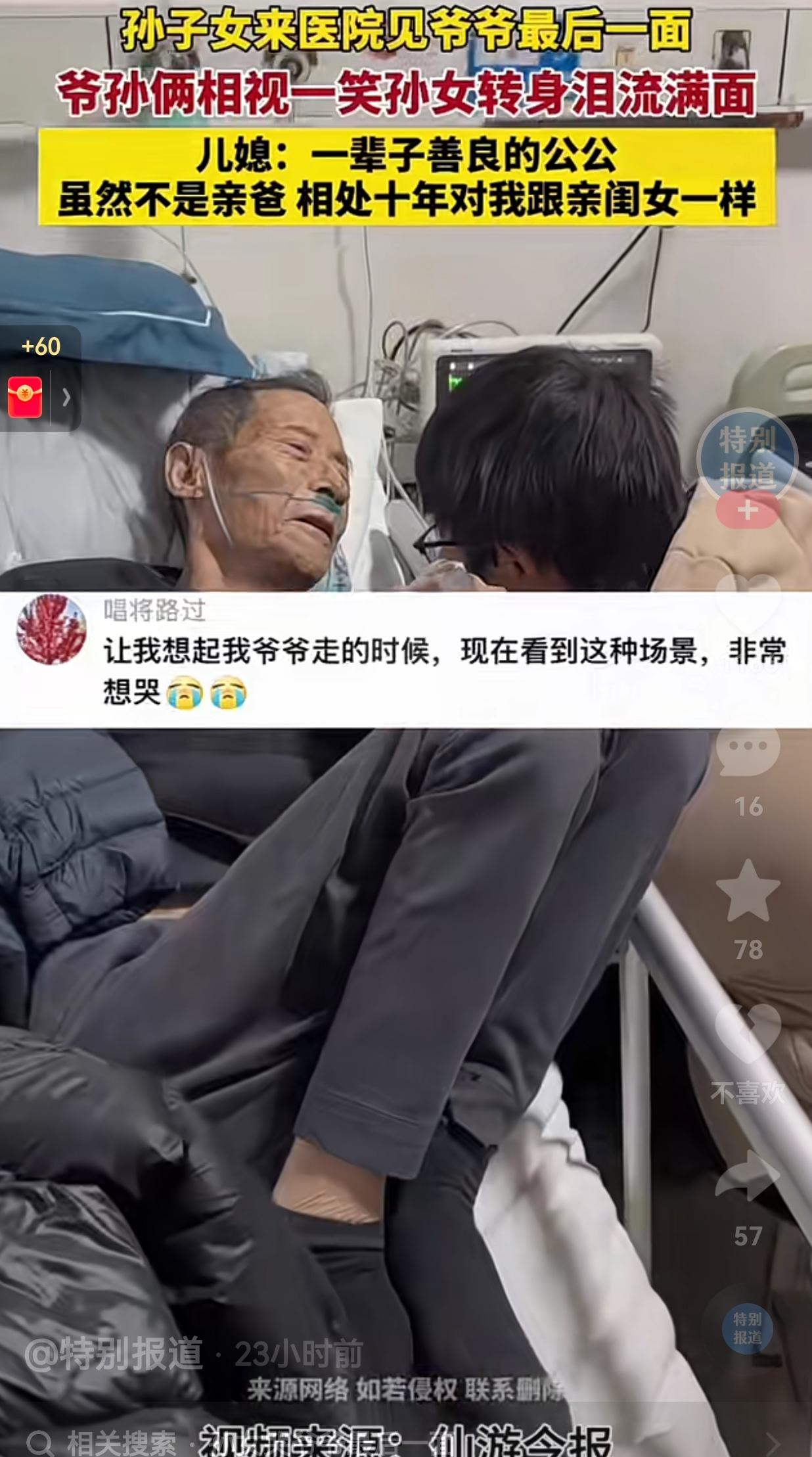 看哭了!人永远学不会跟亲人告别!河南的一家医院里,病床上躺着一位插着氧气管的爷爷,他的孙女儿凑到跟前,爷孙俩就这么对视了一眼,然后都笑了。 那笑,没有声音,却比哭还让人心疼。 下一秒,孙女儿转过身,背对着爷爷,肩膀抖得厉害,眼泪瞬间就砸在了地上。 旁边的儿媳,也就是孩子的妈妈说:“这是我公公,一辈子善良,虽然不是亲爸,但相处十年,他待我就像亲闺女一样。” 医生已经让他们回老家了,情况不好,这一面,就是最后一面。 视频中,爷爷躺在病床上,脸色蜡黄,就连一丝丝说话的力气都没有了。 可当孙女儿凑过来,他还是努力地扯了扯嘴角,露出了一个笑。 孙女儿也笑了,眼睛弯成了月牙,可那笑容里,全是藏不住的悲伤。 他们都知道,这是最后一次见面了。可他们谁都没有哭,因为他们不想让对方难过。 爷爷想告诉孙女儿:“别怕,爷爷没事,你要好好的。” 孙女儿想告诉爷爷:“爷爷,我没事,你放心走吧。” 这一笑,是他们之间最后的默契,也是成年人世界里,最体面的告别。 有网友看到后评论说:“昨天不是还好好的吗?为什么这么快呢?” 其实,我们总以为,日子还长,还有很多时间去陪伴,去弥补。 可现实往往是,一个转身,就是永别。就像这个爷爷,前一天病情还很稳定,一切还好好的,今天就已经到了生命的尽头。 我们一直在忙着工作,总说有时间就回家看看爸妈。等我赚够了钱,就带孩子去旅游等我有空了,就好好陪陪爱人。 可我们忘了,时间不等人,生命也不等人。有些爱,一旦错过,就再也没有机会重来。
