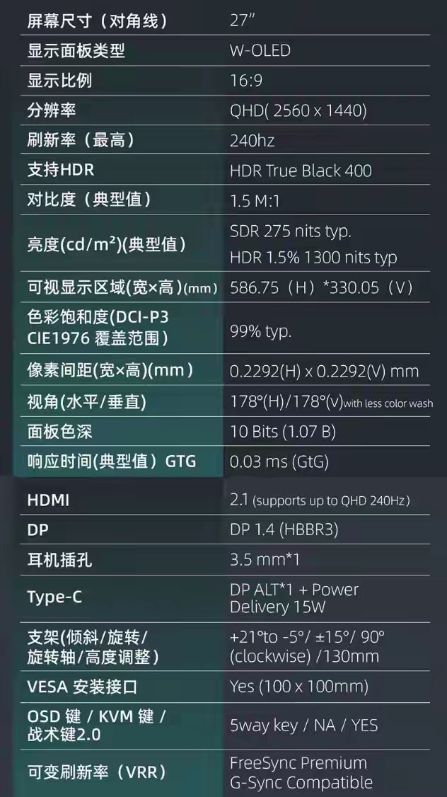 这款显示器搭载一块 2560x1440 分辨率 240Hz W-OLED 面板,能够有效减少光线漫射,支持 10-Bit 色深,覆盖 99% DCI-P3 色域,满足游戏之余的观影、修图需求,GTG 响应时间为 0.03ms,让用户在 FPS 游戏中抢占先机,兼容 G-Sync 防撕裂技术。