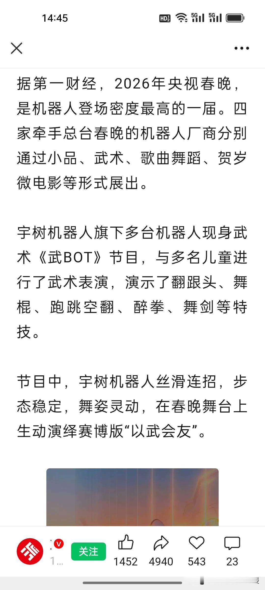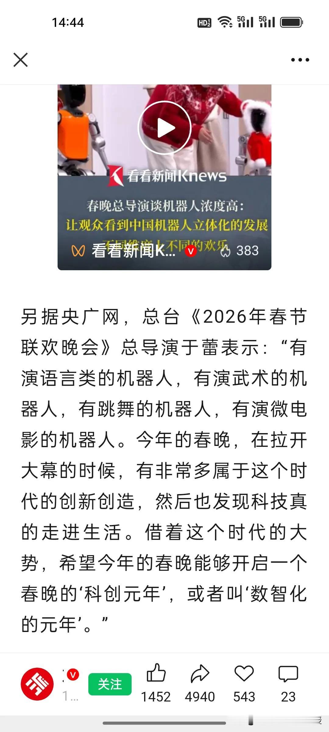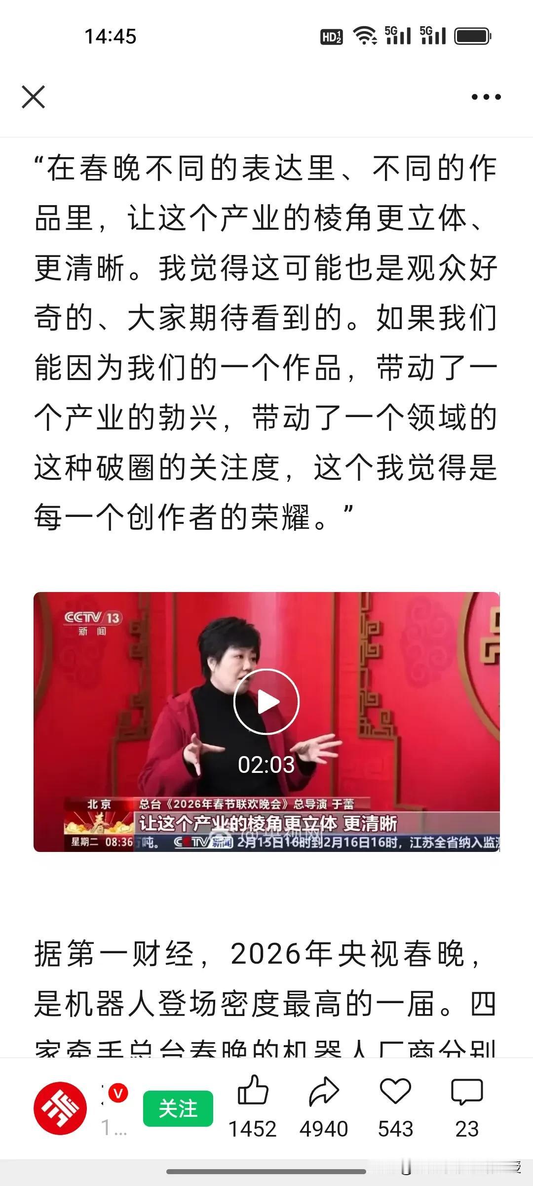 关于今年春晚机器人“浓度”太高,春晚总导演于蕾的解释来了!机器人霸屏背后藏着大国底气! 当宇树机器人耍醉拳、63万通用机器人在京东被秒空,春晚已经不只是一台全家团圆的晚会了。 今年舞台上,武术、小品、微电影,舞蹈处处可见机器人的身影,四个品牌机器人同场竞技,而且各方面技术都是大跨越的进步,有网友调侃说机器人已经从“霍金变成霍元甲”,这早已超越娱乐本身。 于蕾导演说今年春晚开启了“科创元年”,“让观众看到中国机器人产业立体化的状态”,正是中国新质生产力走向普通百姓生活的生动预演。从技术展示到消费热潮,春晚完成了从“合家欢”到“国力窗”的进阶。 大家要明白,如今的春晚不仅是一场团圆晚会,更是大国实力的硬核宣介。大阅兵几年才会有一次让大家看到中国军事力量的腾飞,但是春晚年年有,可以向老百姓展示每年的中国科技成就。看懂了这届春晚的科技浓度,就读懂了中国未来的发展速度。