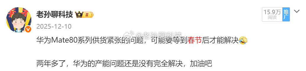 华为Mate80系列供应压力基本缓解,春节过后就能大规模的满足需求