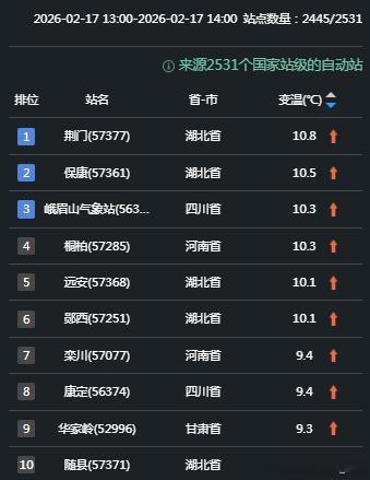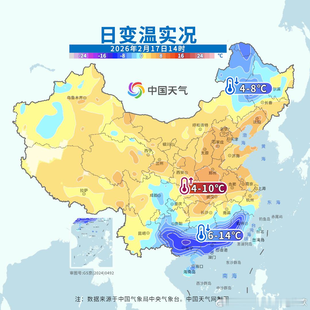 【升温和降温】今天北方大部地区到长江中下游地区,气温回升。湖北河南等地升温最明显,湖北荆门升10.8℃,为14时全国升温最强站点。昨天暖热的江西南部、福建、广东、广西,今天因为冷空气到来,出现8-16℃降温。江西定南降16.7℃、福建三明降16.1℃、广东始兴降16℃、广西柳江降15.7℃,为各自省区14时降温最强站点。此外内蒙古东部和黑龙江吉林两省西部,因为弱冷空气影响,也出现降温。