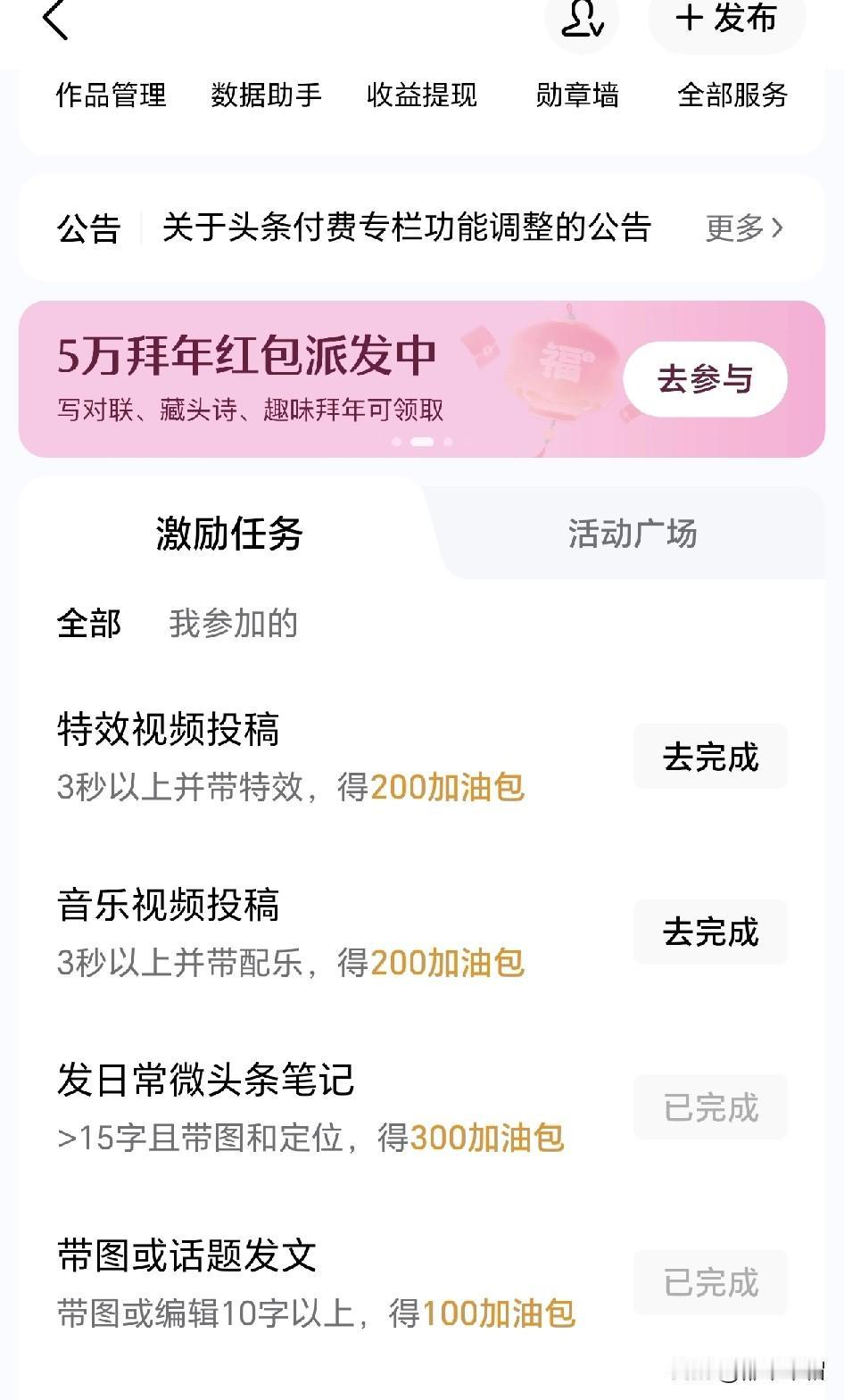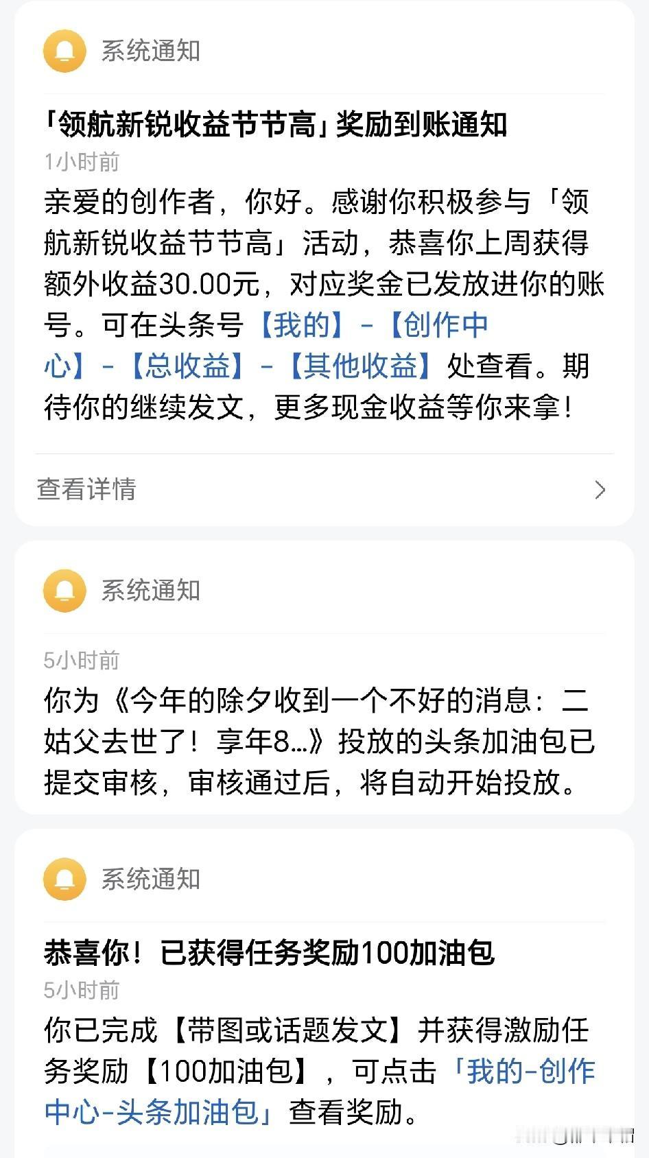 付出终有回报。连续第二周,收到“领航新锐创作者收益节节高”活动额外收益,这次还是30元。应该是上周作品阅读量大于5万,小于10万,如果新锐或领航创作者周阅读量大于10万,就可以得到最高100元的额外收益。 发现一个小技巧,可以分享给跟我一样需要流量的条友们。打开创作页面,会有一个激励任务,发日常微头条笔记,带图或话题发文都要流量奖励,只要按照要求去做,都可以获得流量加油包,流量加油包满五百就可以投放到你喜欢的作品,投放一次可以带动比五百更多的流量。我几乎每天都可以投放一次,条友们可以试一试。