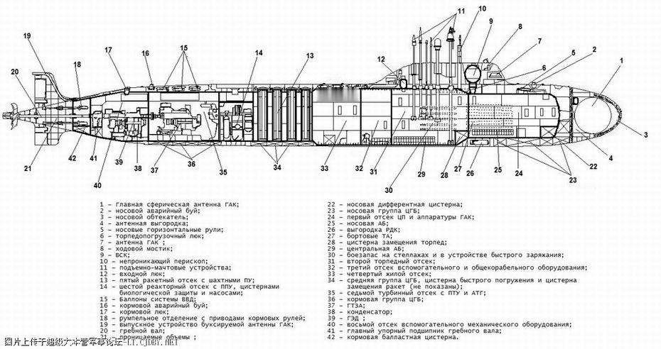从开源信息看,093B的鱼雷舱仍然位于艇艏的第一个舱段(图2),发射管位于艇艏上半部分。美俄先进核潜艇的鱼雷舱则不约而同地为大型声呐基阵让出艇艏空间,挪到了更靠后的位置,鱼雷管口位于艇身两侧。