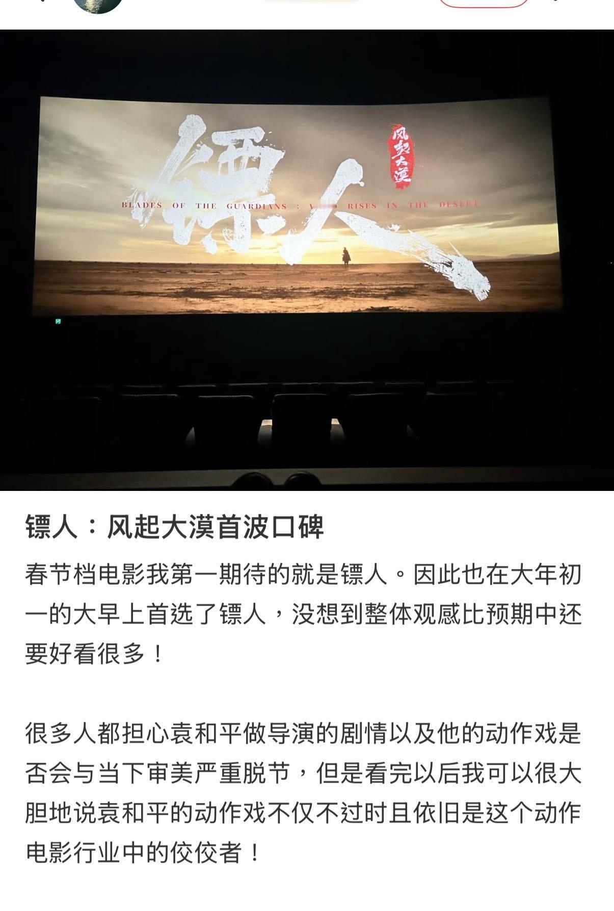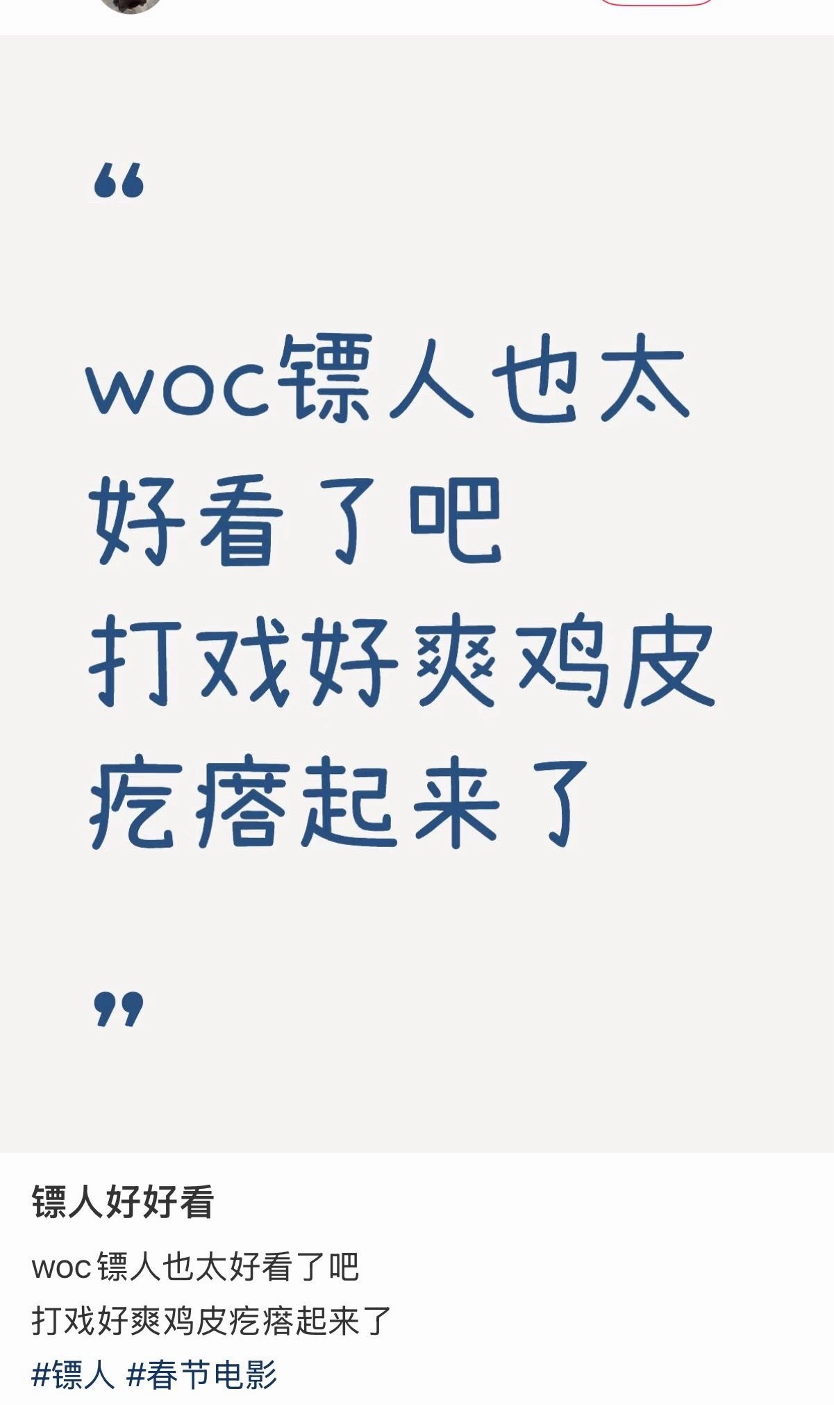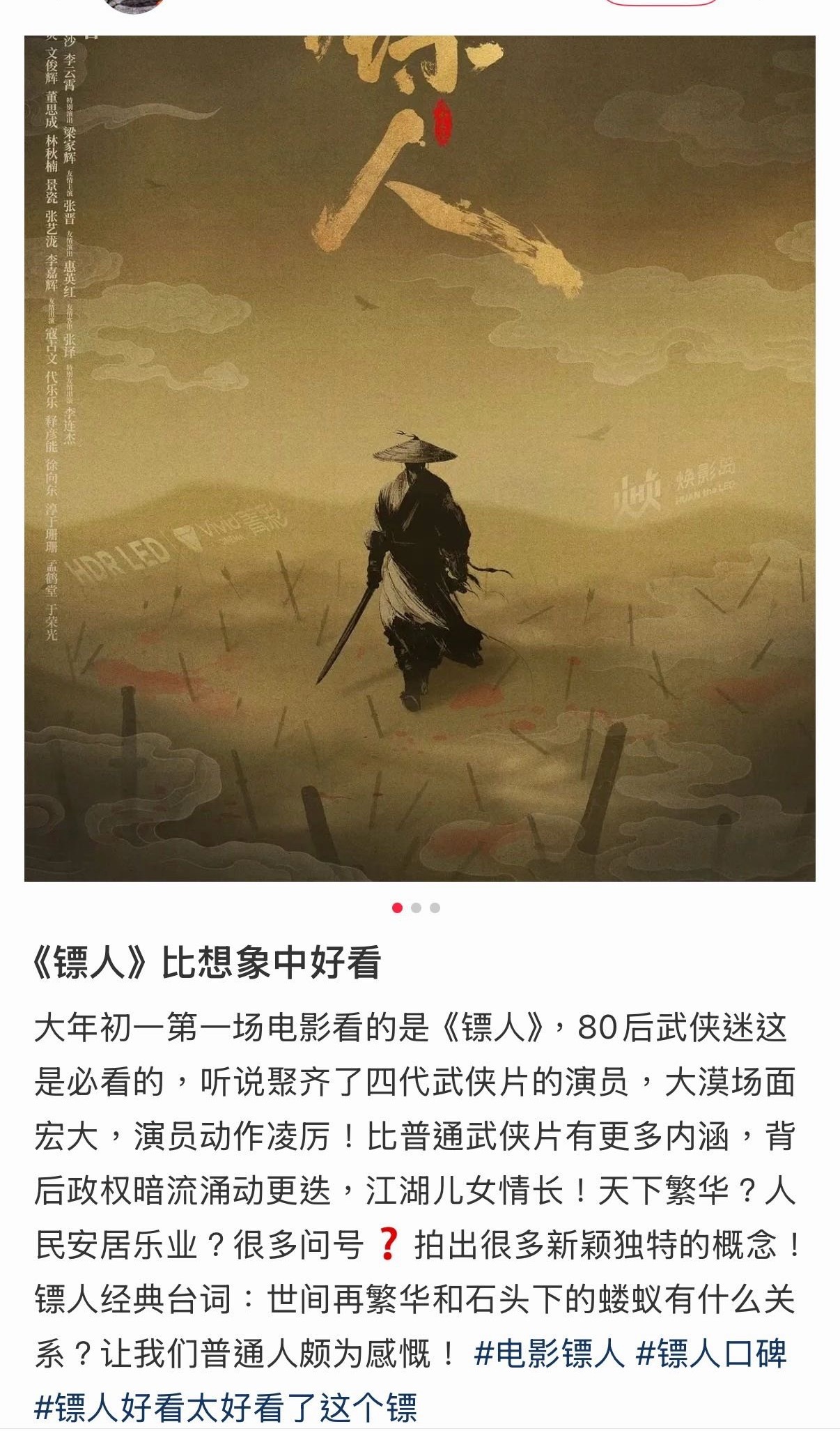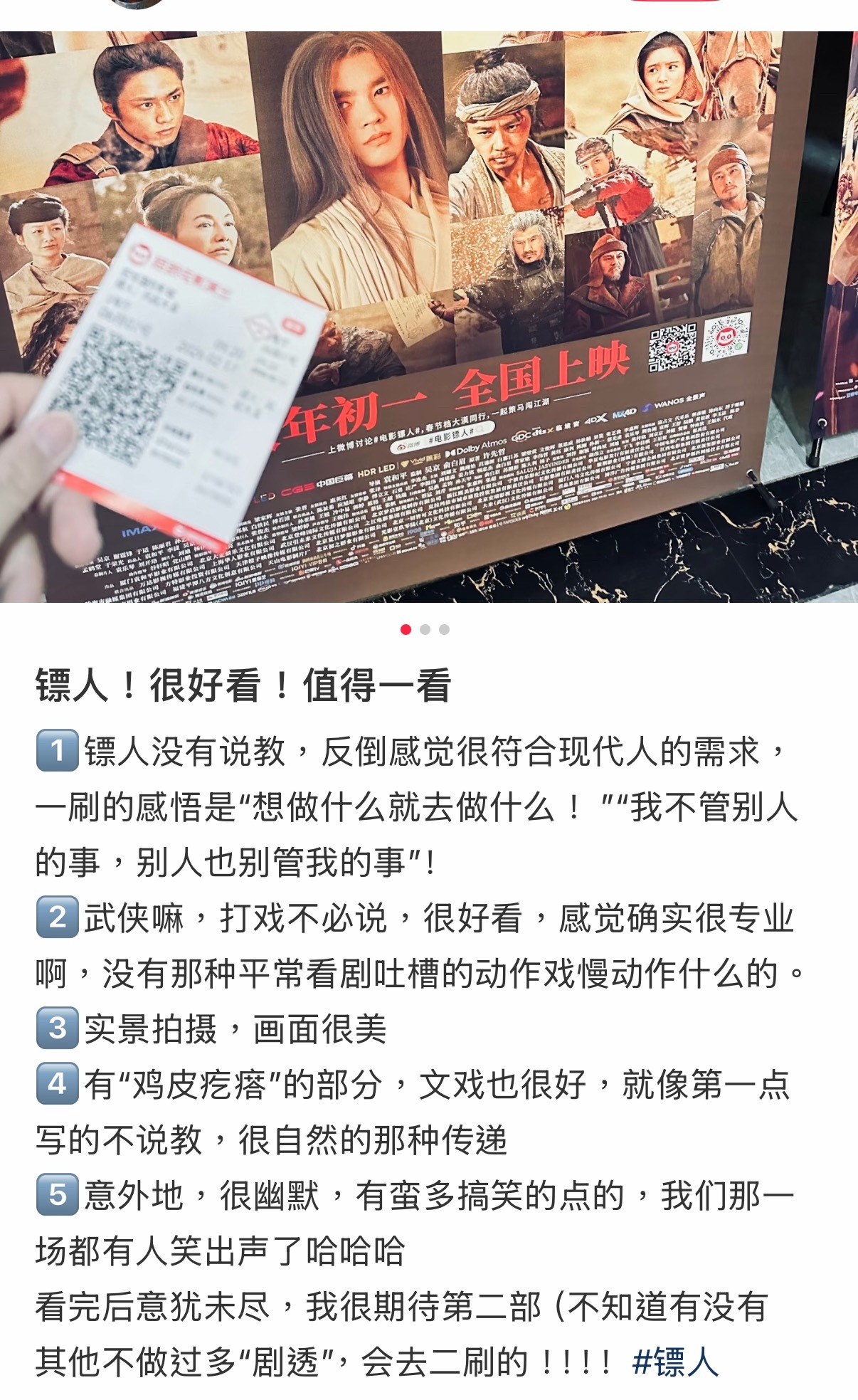 观众称镖人远超预期《镖人》第一波repo已经来了!!超预期的观影体验!打戏顶级,看得鸡皮疙瘩都起来了!!文戏也很好!剧情顺畅!首波口碑真的很好!!!镖人没有说教感,“我不管别人的事,别人也别管我的事”!春节档就该这样!早看早享受!过年都给我冲《镖人》!! 镖人第一波反馈
