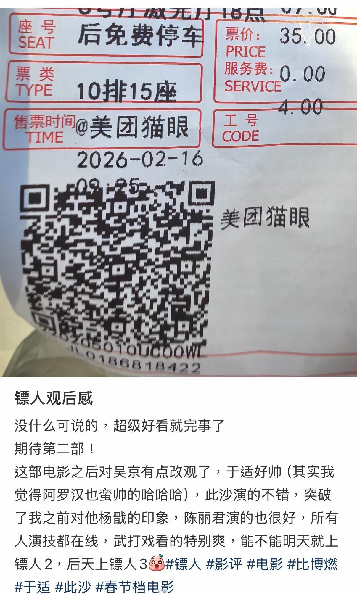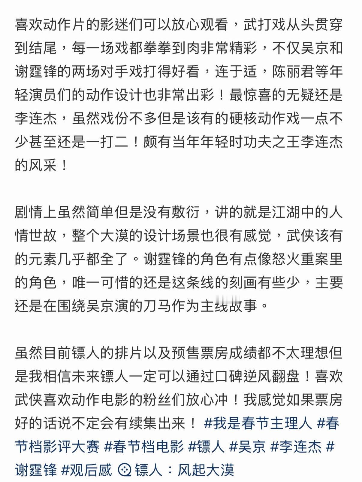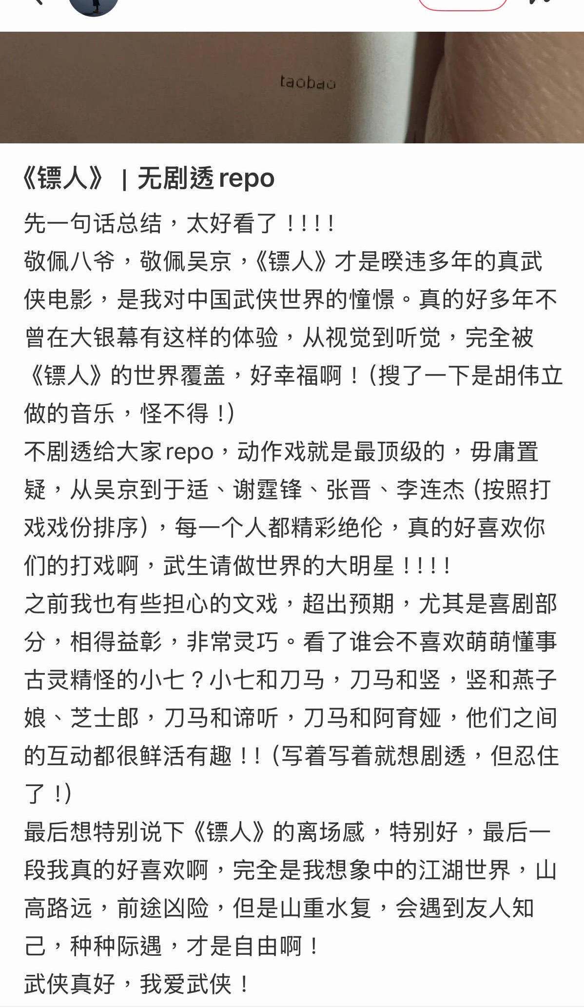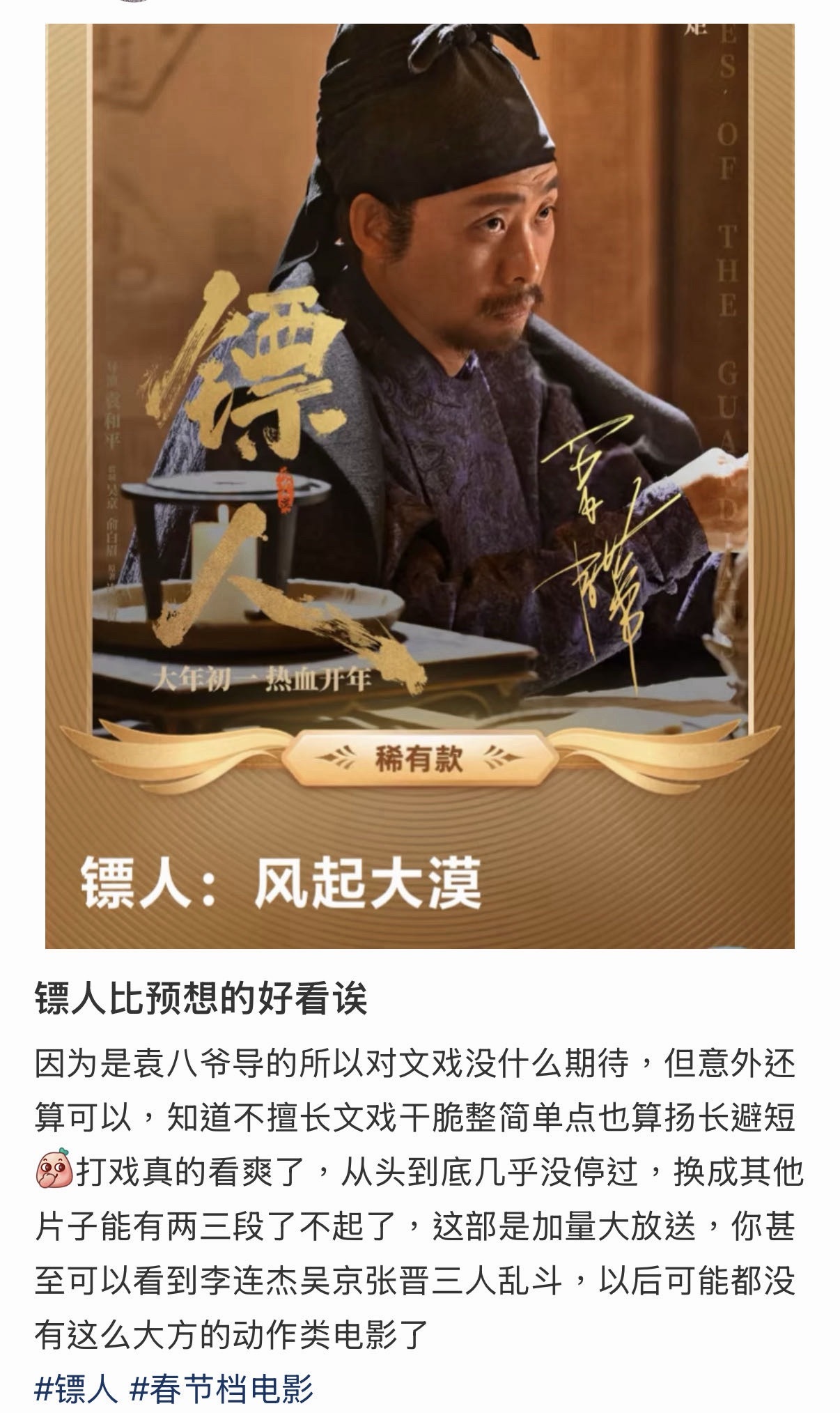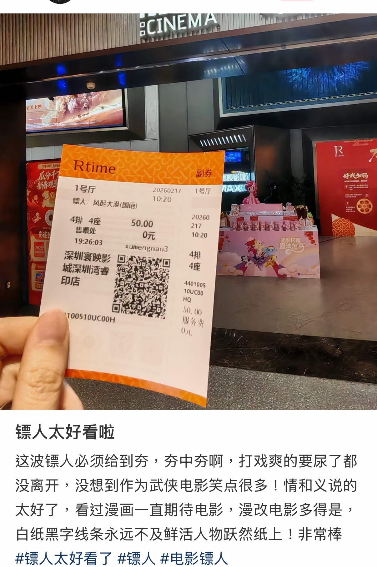 观众称镖人远超预期《镖人》第一波repo已经来了!!超预期的观影体验!打戏顶级,看得鸡皮疙瘩都起来了!!文戏也很好!剧情顺畅!首波口碑真的很好!!!镖人没有说教感,“我不管别人的事,别人也别管我的事”!春节档就该这样!早看早享受!过年都给我冲《镖人》!! 镖人第一波反馈