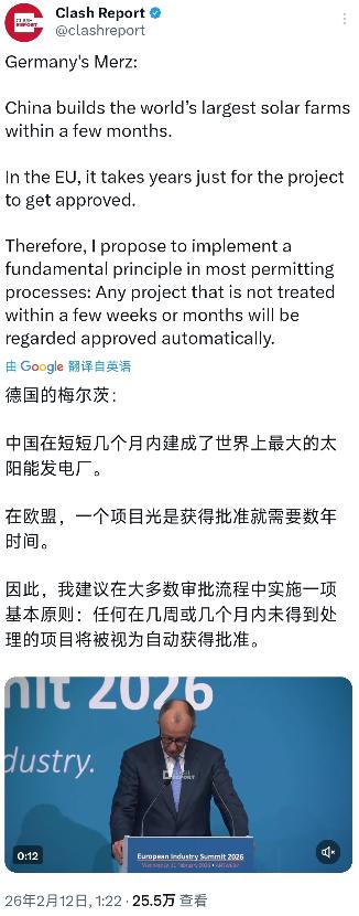 德国总理默茨在欧洲工业峰会上表示:“中国在短短几个月内建成了世界上最大的太阳能发电厂。在欧盟,一个项目光是获得批准就需要数年时间。因此,我建议在大多数审批流程中实施一项基本原则:任何在几周或几个月内未得到处理的项目将被视为自动获得批准。” 默茨口中的中国最大太阳能发电厂,正是位于青海海南藏族自治州共和县的塔拉滩光伏发电园区。这个全球一次性投入最大、单体容量最大的光伏电站群,从2012年正式开工建设,凭借科学规划和高效执行,迅速成长为行业标杆。 整个园区铺设有超过1000万块光伏板,总装机容量达到15730兆瓦,年最高发电量能达到180亿千瓦时,相当于两台核电机组一年的出力。 这样的建设速度背后,是中国简化审批流程的实际举措,分布式光伏项目备案通常只需5-10个工作日,为项目快速推进扫清了障碍。 塔拉滩电站不仅实现了发电目标,还通过光伏板下种草、抬高支架等创新方式,让曾经沙化严重的荒滩变成了植被覆盖率达80%的生态牧场,实现了经济效益与生态效益的双赢,2023年杭州亚运会就使用了这里输送的绿色电力。 反观欧盟,过度监管导致的审批拖延已经成为制约经济发展的突出瓶颈。数据显示,欧盟可再生能源项目并网审批最长可达9年,跨境输电项目平均也要5年时间,即便欧盟有审批应在两年内完成的规定,部分市场的实际周期仍被拉长至10年之久。 这种低效直接导致超过1000吉瓦的可再生能源项目被困在电网接入的等待名单中,大量投资被迫搁置。 亚马逊AWS的高管就曾透露,欧洲部分国家的数据中心电网接入排队已排到2030年代,而数据中心本身的建设周期仅需约两年,这种严重脱节让企业的投资决策充满不确定性。 BusinessEurope的调研更显示,60%的欧盟企业认为项目审批流程需要1到6年,83%的企业将审批的复杂性和时长视为在欧洲投资的障碍,其中53%的企业直言这是“严重问题”。 默茨的建议并非一时冲动,而是基于欧盟当前面临的竞争力下滑压力。他强调过度监管正在阻碍欧盟经济增长,直接削弱了区域对外资的吸引力。 这一呼吁也并非孤立声音,此前德国、法国、意大利等19国领导人已联合致信欧盟,要求对现有条例进行系统性审查,砍掉冗余条款,加快工厂、能源网络等项目审批。 欧盟层面也已有所行动,在电网领域提出计划,为电力项目设定审批时间上限,简单项目不超过6个月,最复杂的项目不超过3年,同时推动对所有欧盟法规进行系统性审查,以实现简化和废除过时条款的目标。 不过默茨的激进建议也面临不小的阻力。法国、意大利、匈牙利等国可能成为反对力量,这些国家担忧自动获批机制会侵蚀成员国的监管主权,更担心跳过必要审查会违背欧盟坚持的环境、劳工和安全标准。 欧盟的审批流程虽慢,部分环节确实是为了充分评估项目对生态环境的影响和征求公众意见,环保组织也担心改革可能让项目绕过关键审查,影响气候目标的实现。这种效率与标准的平衡,成为欧盟改革必须破解的难题。 从现实来看,默茨的表态折射出全球竞争中效率优先的趋势。中国光伏产业的快速发展,既得益于自然条件的禀赋,更离不开审批流程的简化和政策支持的精准。 塔拉滩电站通过水光互补技术解决了光伏发电的间歇性问题,与36公里外的龙羊峡水电站联动,让不稳定的绿电变得平稳可靠,这种技术创新与高效审批的结合,正是中国速度的核心密码。 而欧盟内部监管碎片化、审批环节冗余的问题,已经影响到其在人工智能、生物科技等新兴领域的竞争力,银行业联盟就曾警告,跨境合并困难、资本市场分散导致企业融资过度依赖银行,进一步制约了产业升级。 默茨的建议能否落地,最终取决于欧盟能否在维护自身标准与提升审批效率之间找到平衡点。但无论如何,这场讨论已经让欧盟意识到,在全球清洁能源转型和产业竞争的关键时期,过于繁琐的行政流程可能成为致命短板。 中国在太阳能发电领域的建设成就和效率优势,为包括欧盟在内的世界各国提供了有益参考,而如何在保障合规性的前提下优化审批流程,将是所有追求高质量发展的国家需要共同探索的课题。